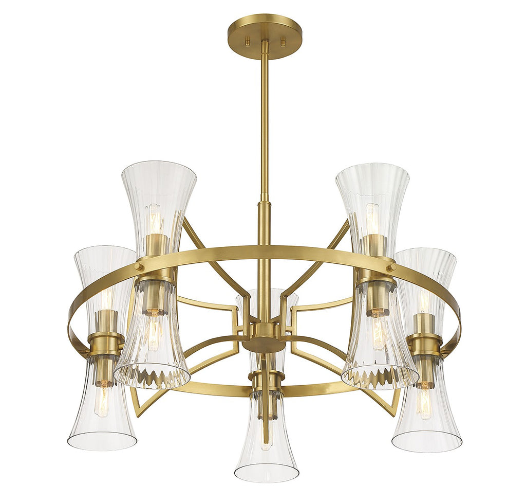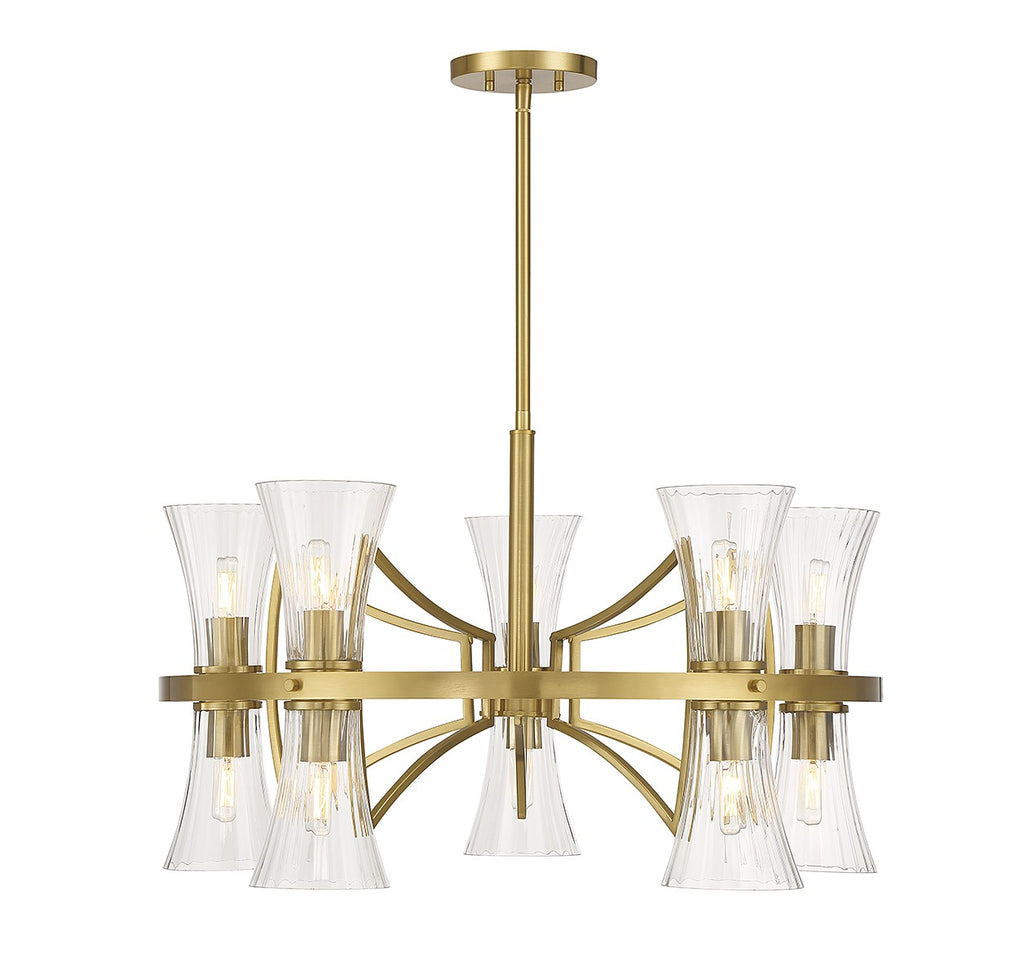 This Savoy House Bennington 10-light chandelier features pleasantly curving shapes that combine to create an intriguing lighting look. Fluted clear glass shades and thoughtful detailing on the structure, finished in warm brass, gives the impression of motion. Bennington is 30.5" in width and has an adjustable height ranging from 18.5" to 72". Comes with four 12" downrods and one 6" downrod. Uses 12 candelabra size bulbs of up to 60 watts per bulb (bulbs not included).