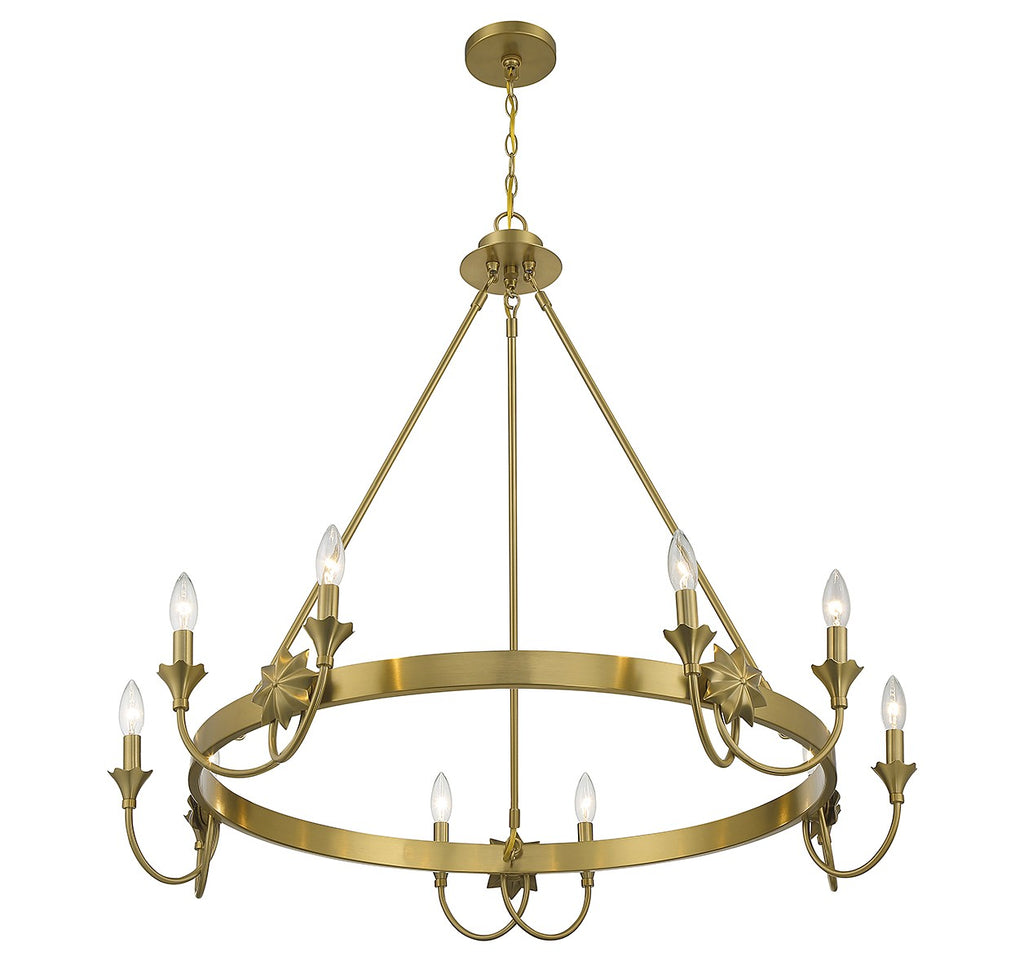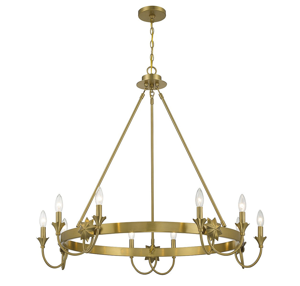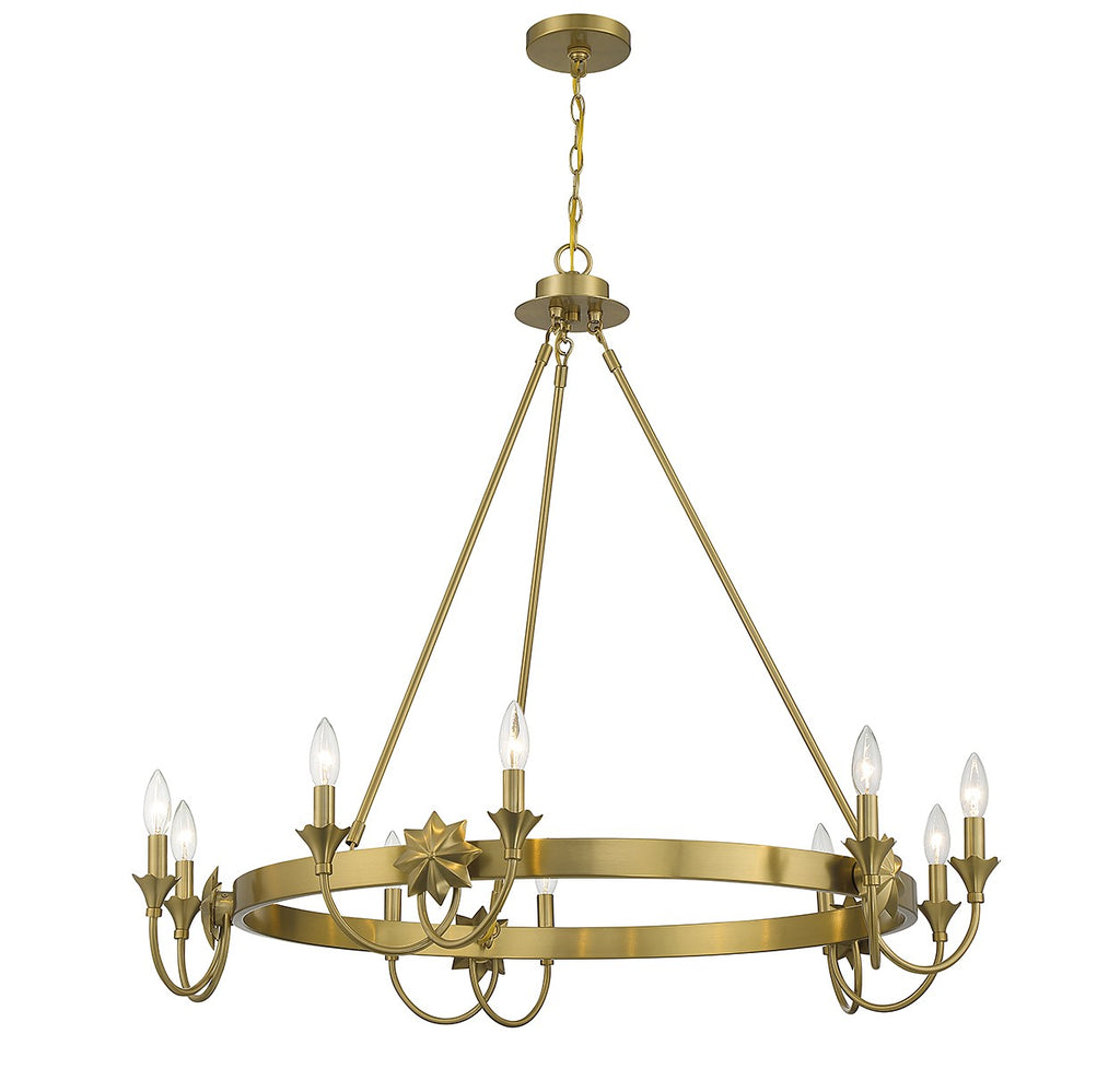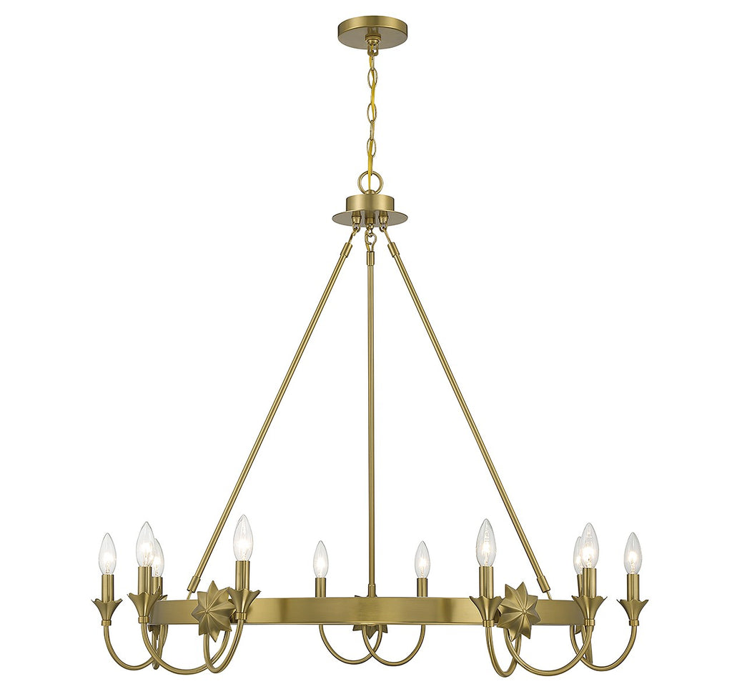 There is beauty in simplicity, as exemplified by this lovely Savoy House Sullivan 10-light chandelier. It is decorated with bold 8-pointed stars and floral bobeche detailing, all finished in warm brass. Sullivan is 35.5" in height and 40" in width. It uses 10 candelabra size bulbs of up to 60 watts per bulb (bulbs not included). Comes with 120" of chain.