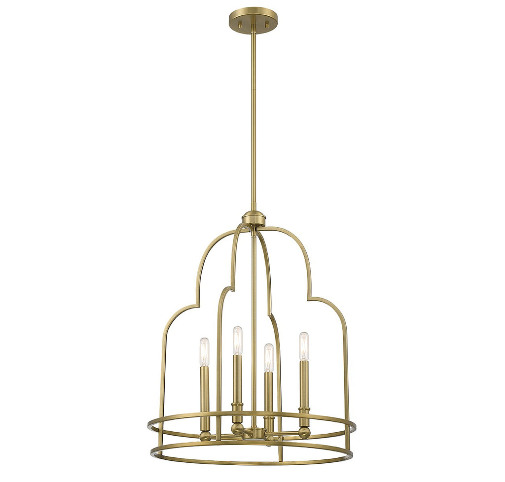 The eye-catching curves on the Savoy House Diplomat 4-light pendant make it an intriguing lighting choice for any space, especially for creating great first impressions in foyers and entryways! Finished in warm brass. Diplomat is 20" in width and has an adjustable height ranging from 25.5" to 79". Comes with four 12" downrods and one 6" downrod. It uses 4 candelabra size bulbs of up to 60 watts per bulb (bulbs not included).