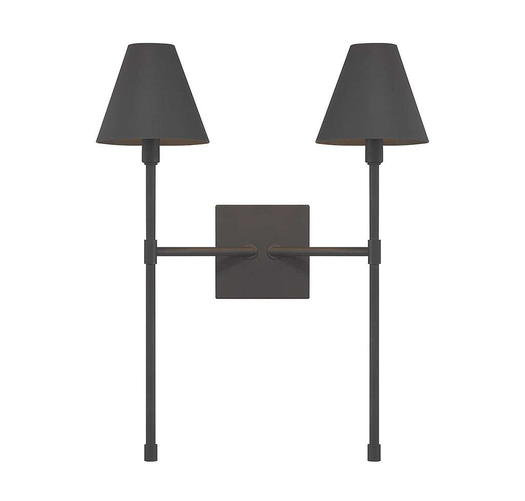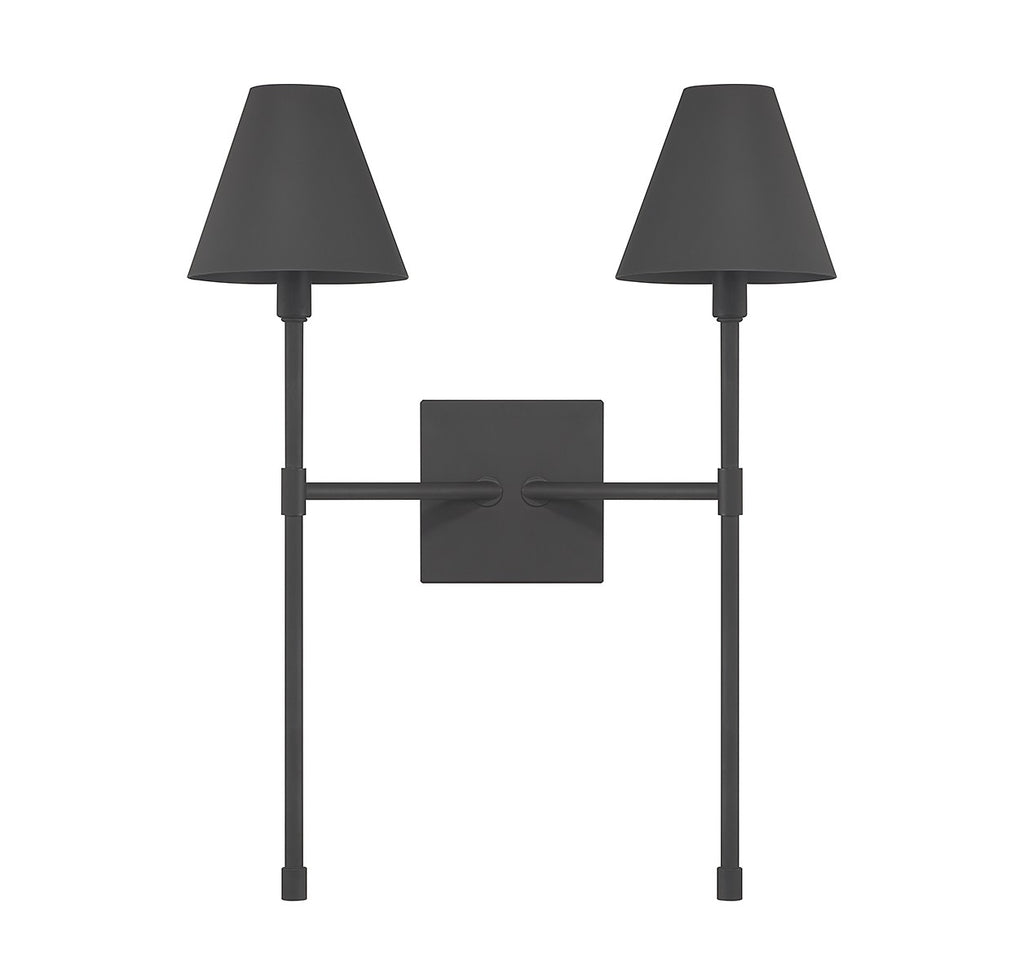 This Savoy House Jefferson 2-light sconce features a long sleek body, metal shades for indirect illumination and a classy, contemporary silhouette. Matte black finish. Jefferson is 20" in height, 16" in width and extends 7" from the wall. It uses two candelabra size bulbs of up to 60 watts per bulb (bulbs not included).