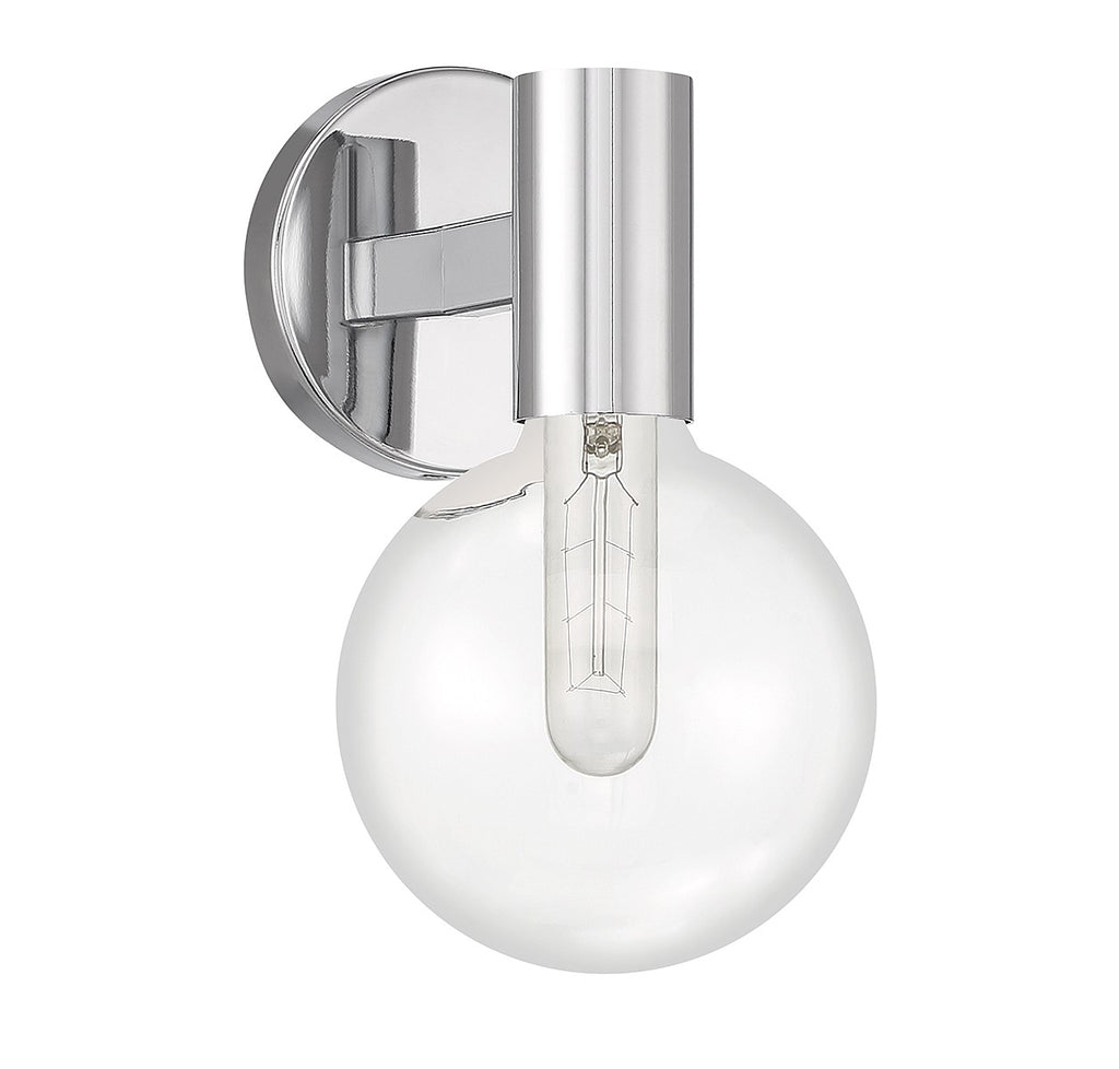 This Savoy House Wright 1-light sconce showcases streamlined style that makes it ideal for any space. A round clear glass shade adds an extra dimension and extra protection for the light bulb within. Chrome finish. Wright is 10" in height, 5.75" in width and extends 7.5" from the wall. Uses 1 standard size bulb with a max of 60 watts (bulb not included). We recommend using a tubular shaped bulb.