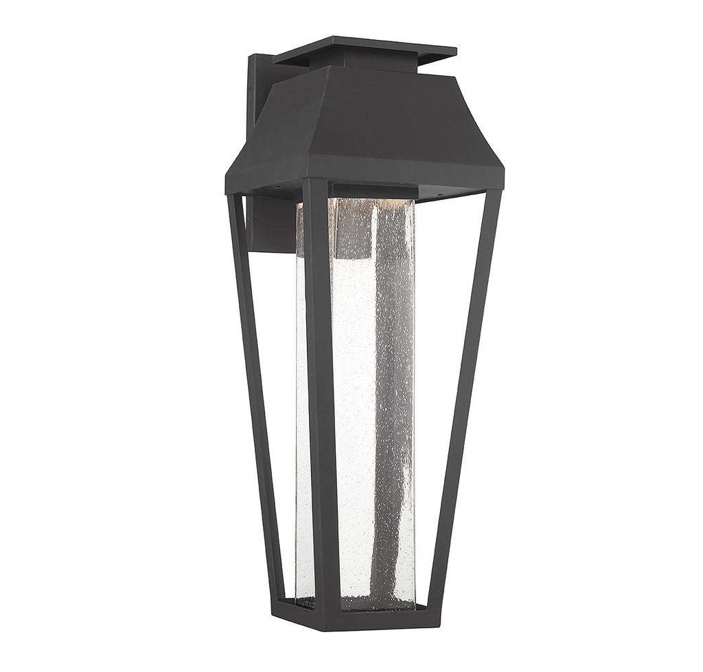 From Savoy House, the Brookline 1-light outdoor wall light showcases a more contemporary take on classic lantern-style illumination with a central column of clear seeded glass illuminated by integrated LED light. The matte black finish adds versatility. Brookline is 32.25" in height, 12" in width and extends 14" from the wall.