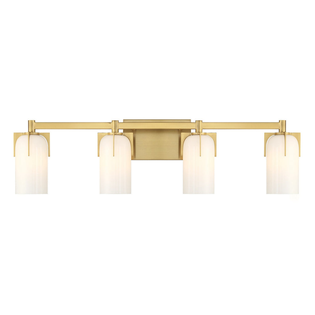 Bring fashionable, vintage-inspired lighting home with the Savoy House Caldwell 4-light bath bar. Etched white opal glass shades are held in place with dramatic jewelry-like prongs that are finished in Warm Brass. Caldwell is 8.5" in height, 32" in width and extends 5.5" from the wall. It uses four candelabra size bulbs of up to 60 watts per bulb. Bulbs not included. This bath light is damp area rated and must be installed as shown.