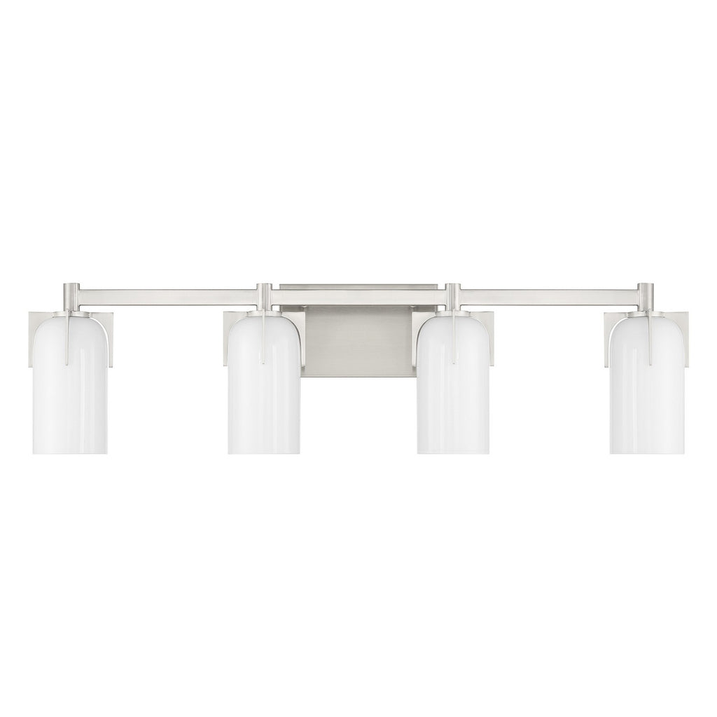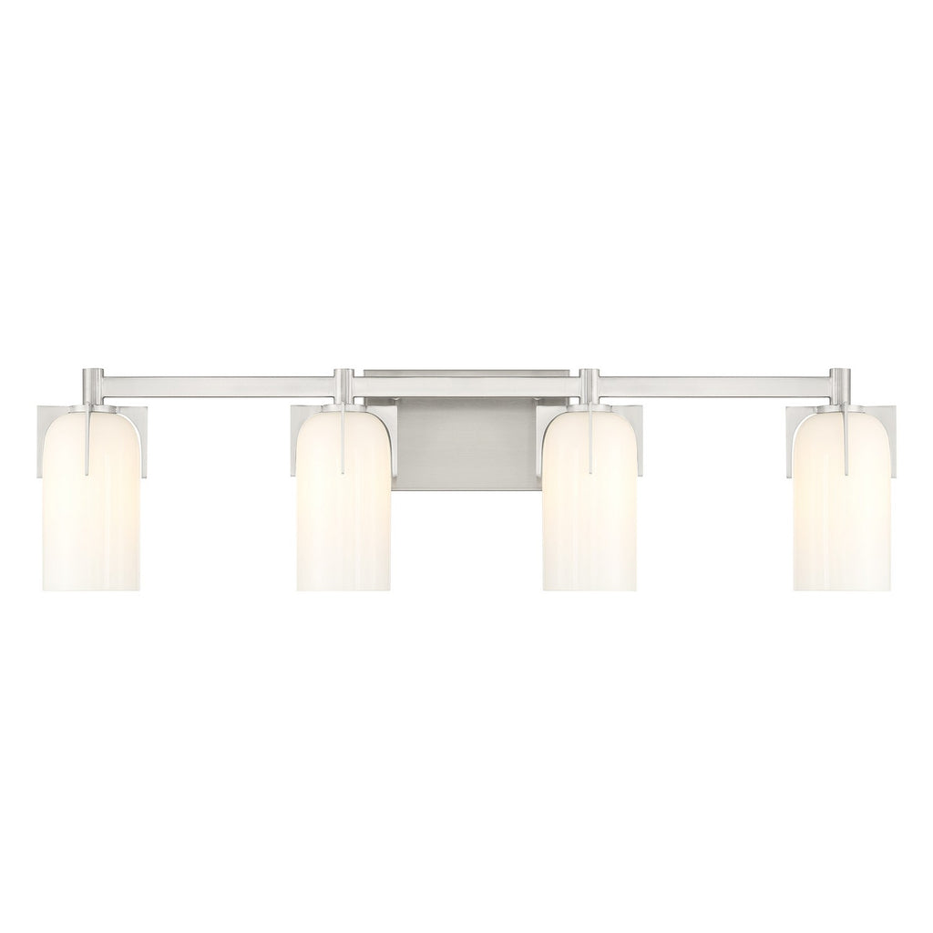 Bring fashionable, vintage-inspired lighting home with the Savoy House Caldwell 4-light bath bar. Etched white opal glass shades are held in place with dramatic jewelry-like prongs that are finished in Satin Nickel. Caldwell is 8.5" in height, 32" in width and extends 5.5" from the wall. It uses four candelabra size bulbs of up to 60 watts per bulb. Bulbs not included. This bath light is damp area rated and must be installed as shown.
