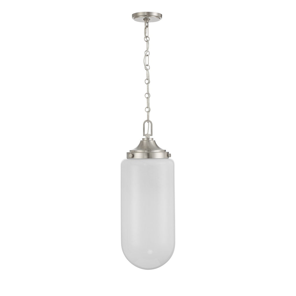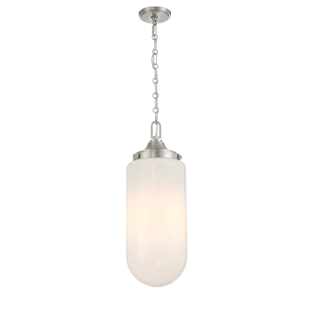 Decorate your space with the Savoy House Bryant 3-light pendant. Its understated structure allows the shade of beautiful, eye-catching strie glass to take center stage. This look is great when used solo or in groupings. Satin Nickel finish. 24.75" in height and 9" in width. Uses three standard size bulbs of up to 60 watts per bulb. Bulbs not included.