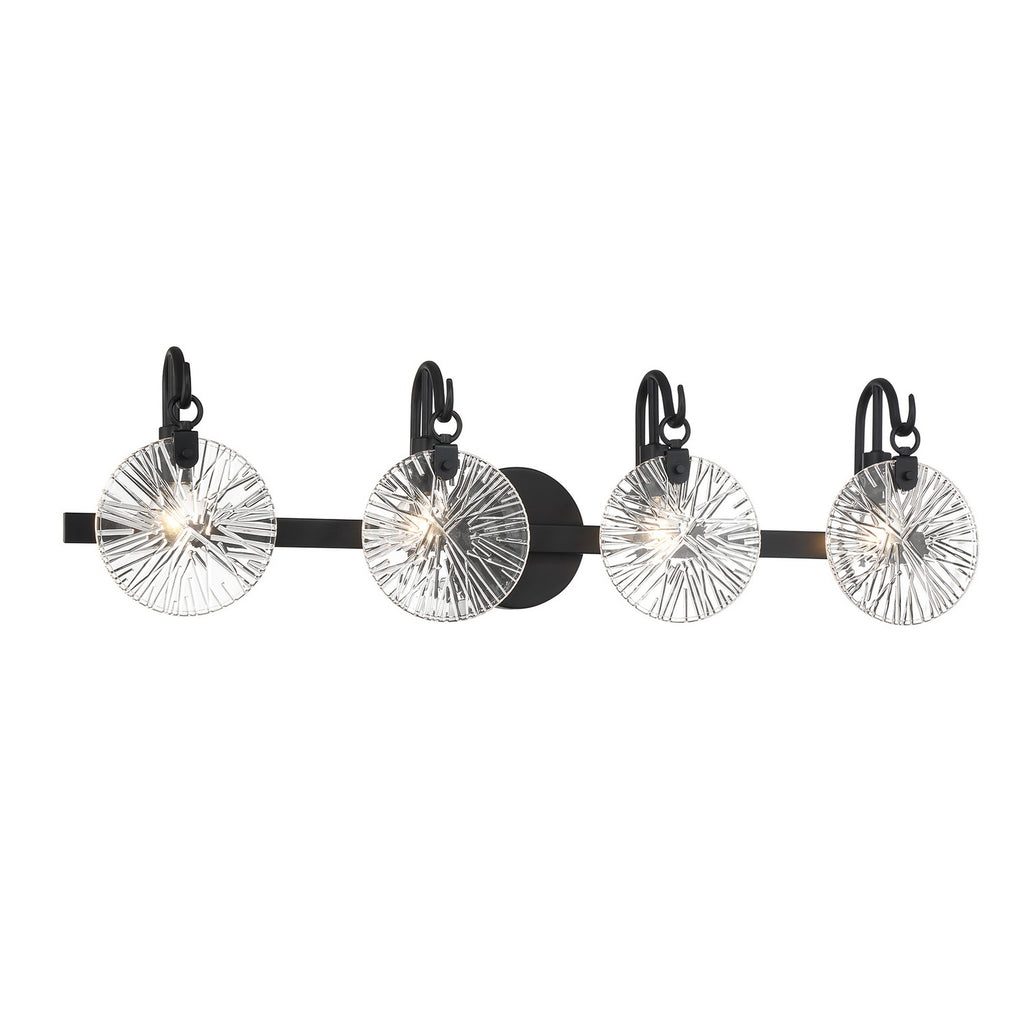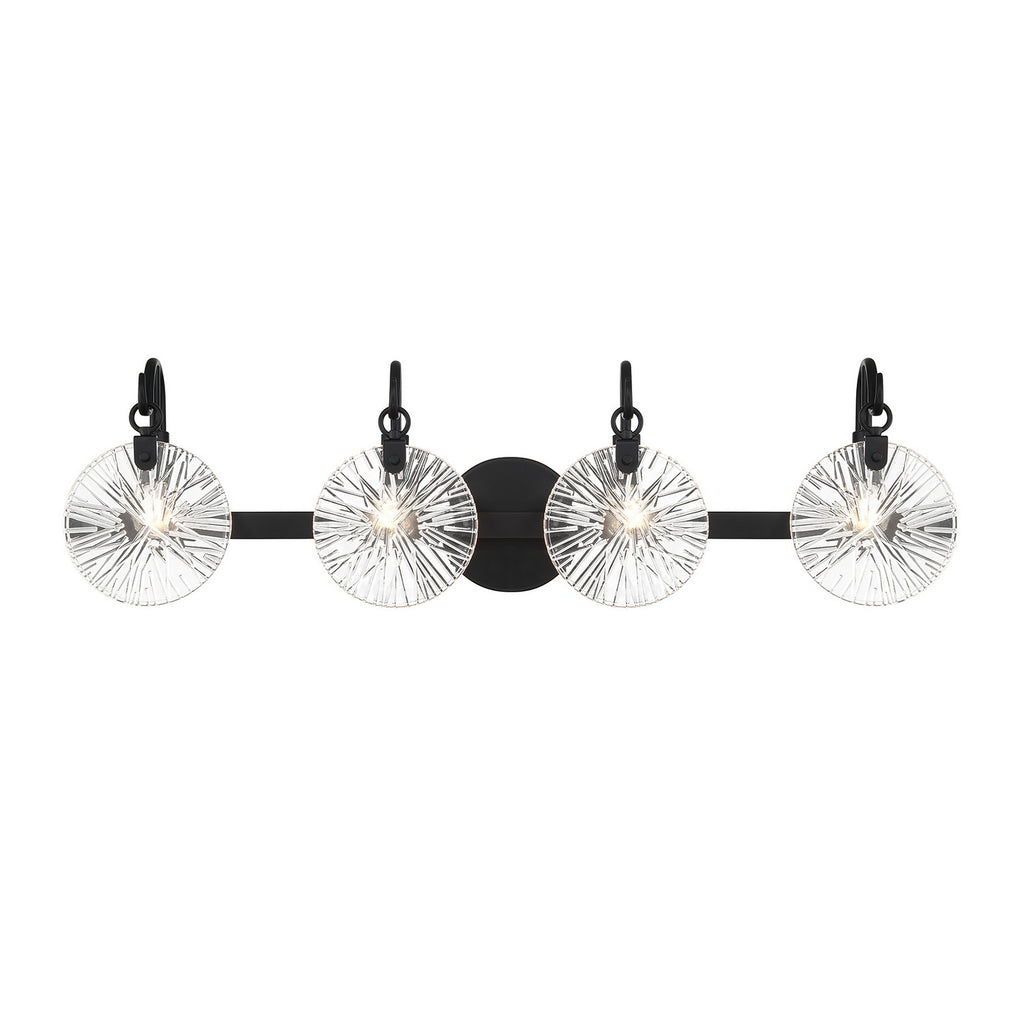 It is often said that lighting is the jewelry of the home. With its fun hook-style arms that hold flat, round, starburst clear glass shades, the Savoy House Addison 4-light bath light is a great example of this saying. The backplate is finished in Matte Black and mimics the shape of the glass shades. Addison is 9" in height, 32" in width and extends 6.5" from the wall. Uses four candelabra size bulbs of up to 60 watts per bulb. Bulbs not included. This bath bar is damp area rated and must be installed as shown.