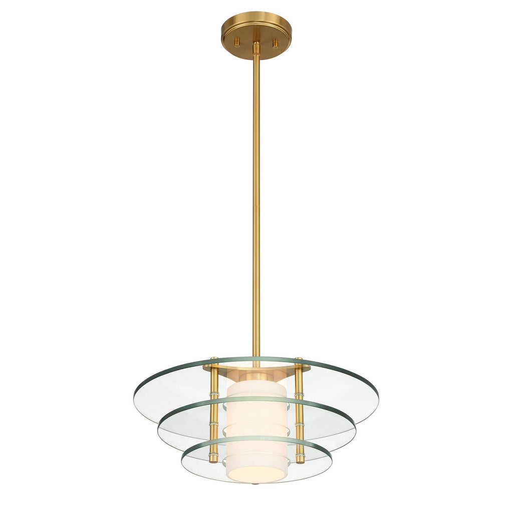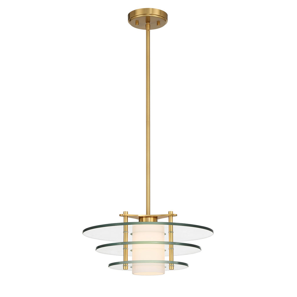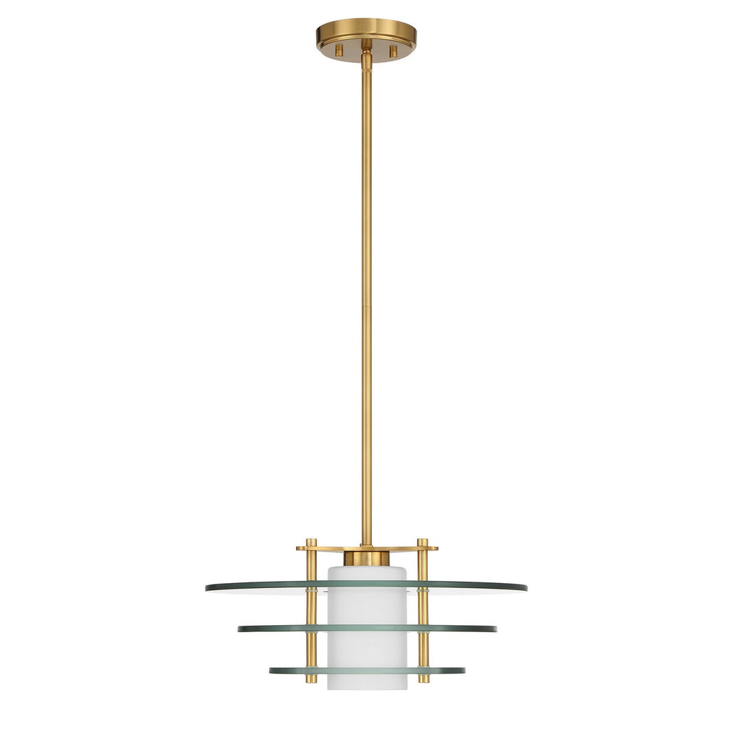The Newell 1-light pendant from Savoy House is a standout example of Art Deco style. Three sleek discs of clear glass surround a core shade of opal glass to create a bright and intriguing glow. The Warm Brass finish is bright and chic. Newell is 20" in width and has an adjustable height ranging from 6.75" to 60.75". Comes with four 12" downrods and one 6" downrod. Uses one standard size bulb of up to 60 watts. The bulb is not included.