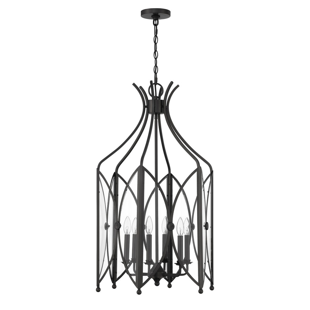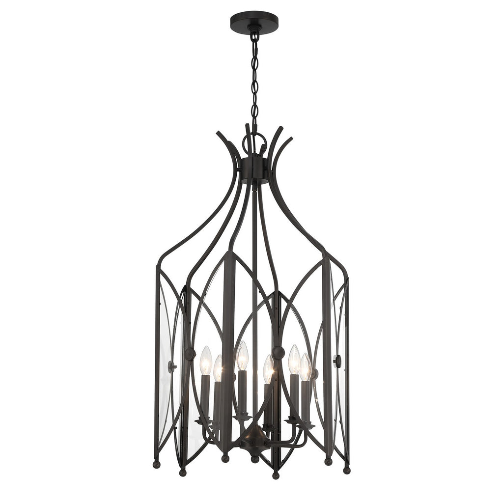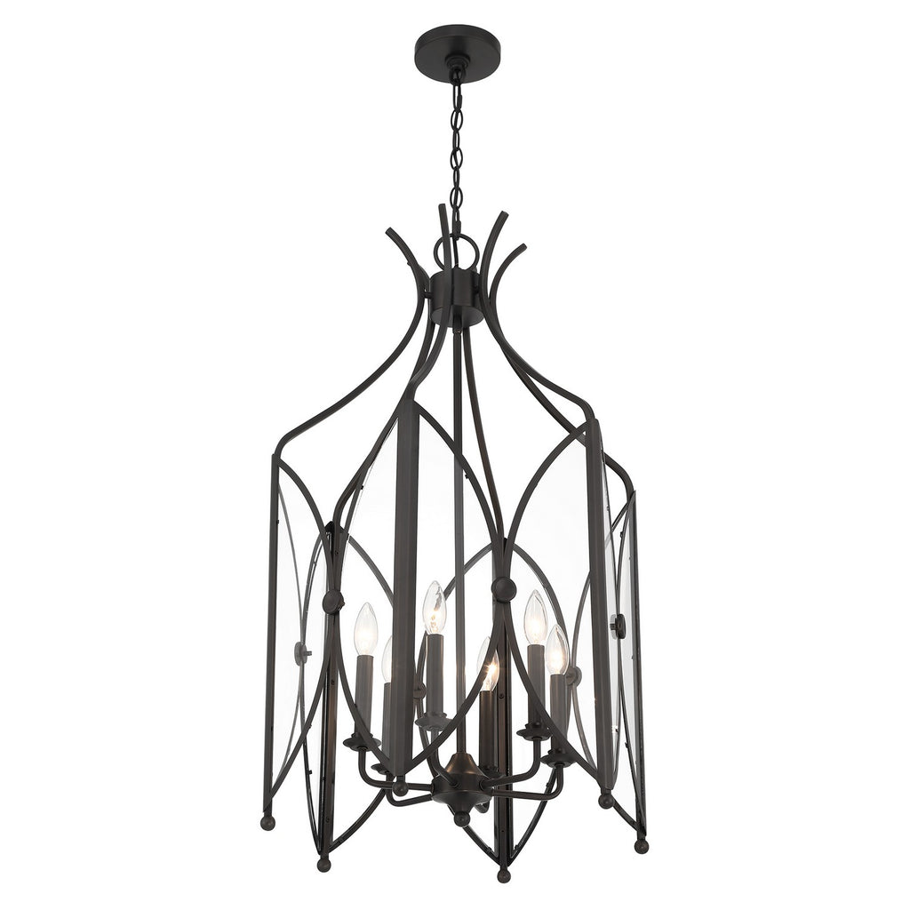 Elegant and dramatic, the Savoy House Enclave 6-light lantern offers a strikingly beautiful lighting look. It is decorated with panes of clear glass in curving frames that recall the look of leaves and seem to multiply the lights within. The Black Tourmaline finish adds a bold touch of luxury. Enclave is 35" in height and 21" in width. It uses six candelabra size bulbs of up to 60 watts per bulb. Bulbs not included.