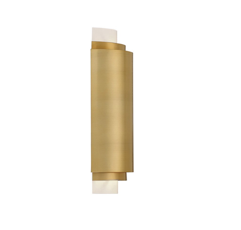 The Savoy House Beacon collection gives a stylish update to a classic Modern design. White frosted glass accents add balance to this two-light sconce in a Burnished Brass finish. Measuring 8" wide x 16"high and extending 4" from the wall, the fixture provides ample illumination from two 60-watt candelabra size bulbs.