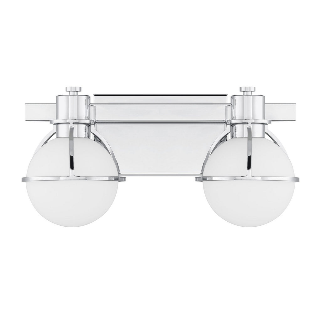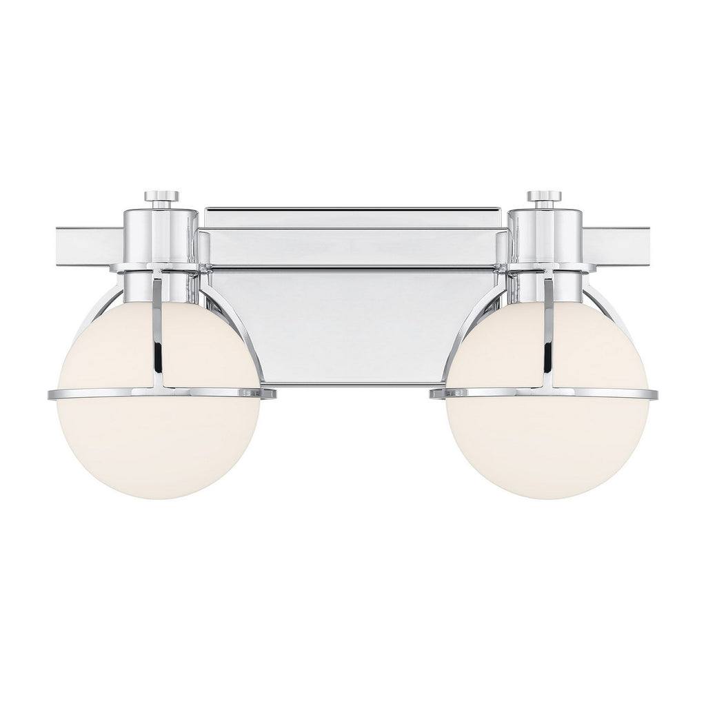 The Savoy House Pierce 2-light bath light offers up a retro, factory-inspired style that makes it an excellent choice for stylish bathroom lighting. Slender, curving half-cages finished in Chrome securely hold orbs of white opal glass that will provide a bright and welcoming glow. Pierce is 7.5" in height, 15.5" in width and extends 7" from the wall. Uses two G9 style bulbs of up to 60 watts per bulb. Bulbs not included. Install as shown. This bath bar is damp area rated.