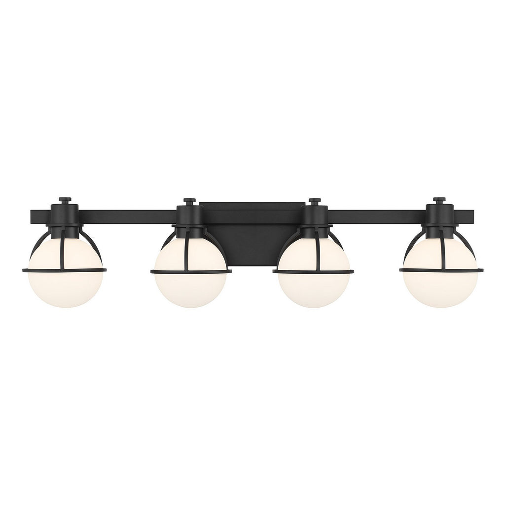 The Savoy House Pierce 4-light bath light offers up a retro, factory-inspired style that makes it an excellent choice for stylish bathroom lighting. Slender, curving half-cages finished in Black securely hold orbs of white opal glass that will provide a bright and welcoming glow. Pierce is 7.5" in height, 32" in width and extends 7" from the wall. Uses four G9 style bulbs of up to 60 watts per bulb. Bulbs not included. Install as shown. This bath bar is damp area rated.