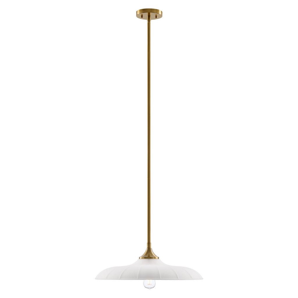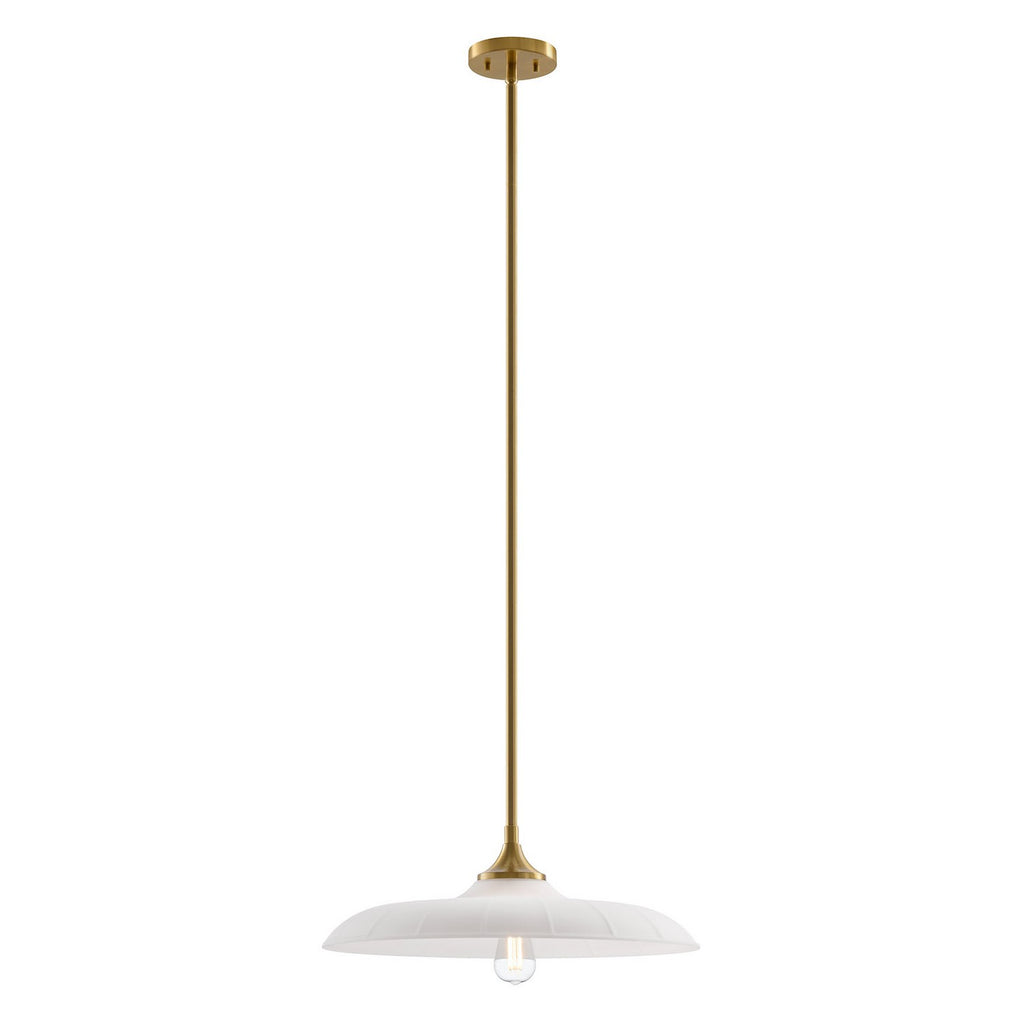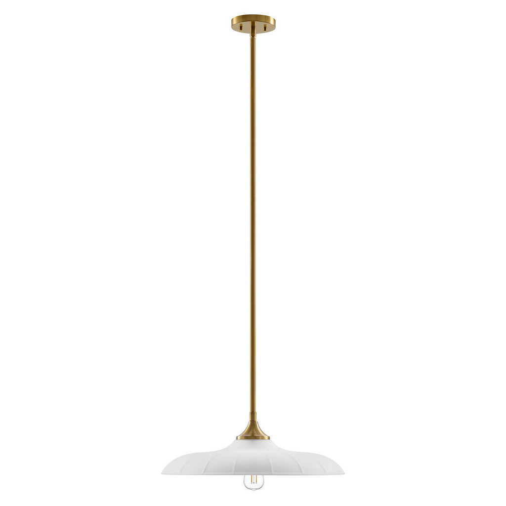 Welcome a look inspired by vintage workshop style with the Savoy House Hadley 1-light pendant. Its sleek, standout shade of subtly ribbed opal glass pairs beautifully with the Warm Brass finish. Use it solo or in groupings for a big boost of appeal! Hadley is 20" in width and has an adjustable height ranging from 6.63" to 60.63". It uses one standard size bulb of up to 60 watts. Bulb not included. Comes with four 12" downrods and one 6" downrod.