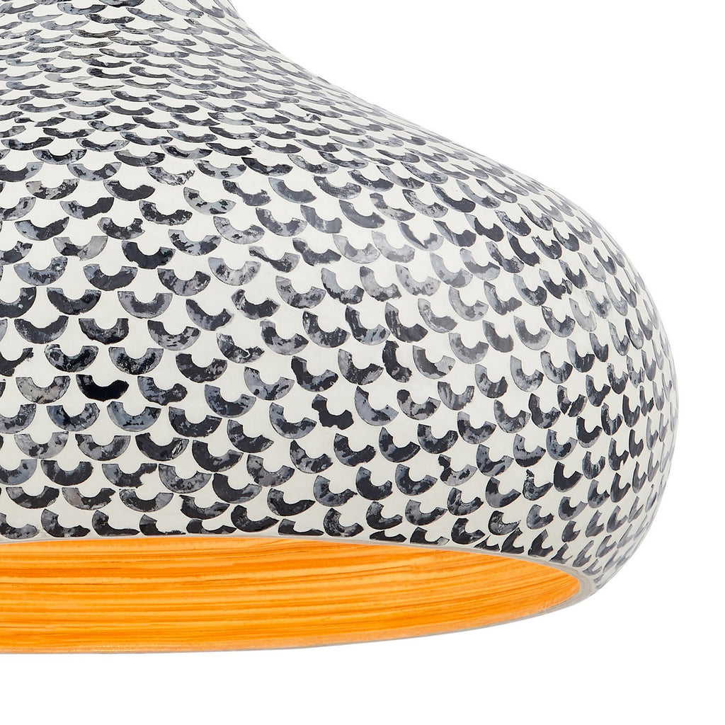 The Savoy House Jade 1-light pendant lets you illuminate your home with natural beauty. Its gourd-shaped shade is crafted from spun bamboo and is adorned with an intricate black fish scale pattern on a white background, creating energetic intrigue. Whether used solo or in groupings, Jade is sure to stand in the spotlight! It is 13" in height and 18" in width. Uses one standard size bulb of up to 60 watts. Bulb not included. This fixture is supplied with 120" of hanging cord.