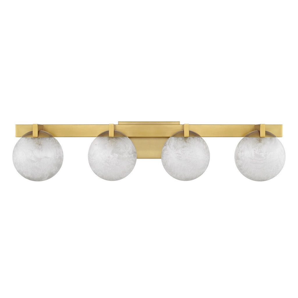 The Savoy House Darien is a 4-light bath bar with fabulously chilly appeal. A minimal frame is finished in bold Warm Brass and holds four orbs of Ice Glass, adding sub-zero cool with tons of frosty texture. Darien is 7.25" in height, 33" in width and extends 7.25" from the wall. Uses four candelabra size bulbs of up to 60 watts per bulb. Bulbs not included. This bath bar is damp area rated.