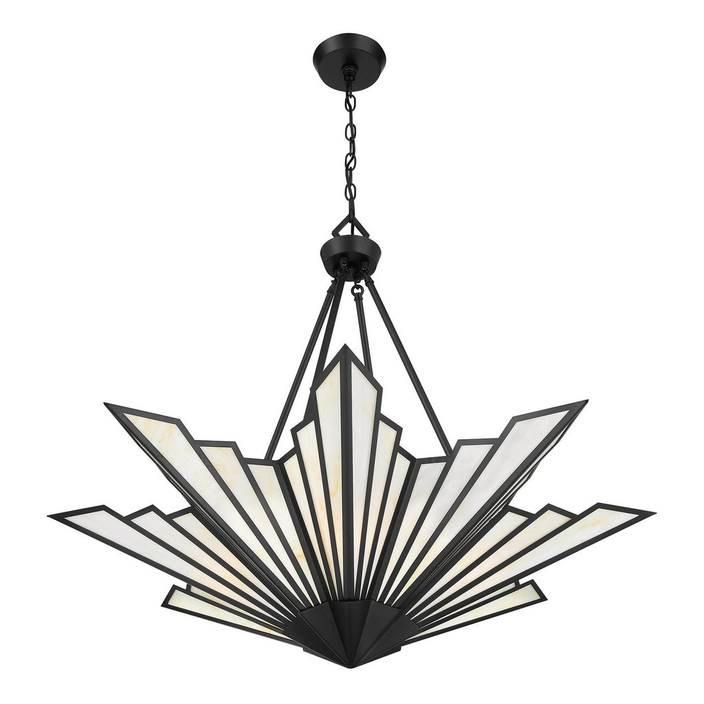Bring a touch of Art Deco glamour to any space with the chic Savoy House Rivage 4-light pendant. Its fan-like structure is decorated with panes of beautiful Tiffany art glass and finished in Matte Black. Use it alone or in groupings for timeless allure. Rivage is 31" in height and 36" in width. Uses four standard size bulbs of up to 60 watts per bulb. Bulbs not included. Comes with 10 feet of chain.
