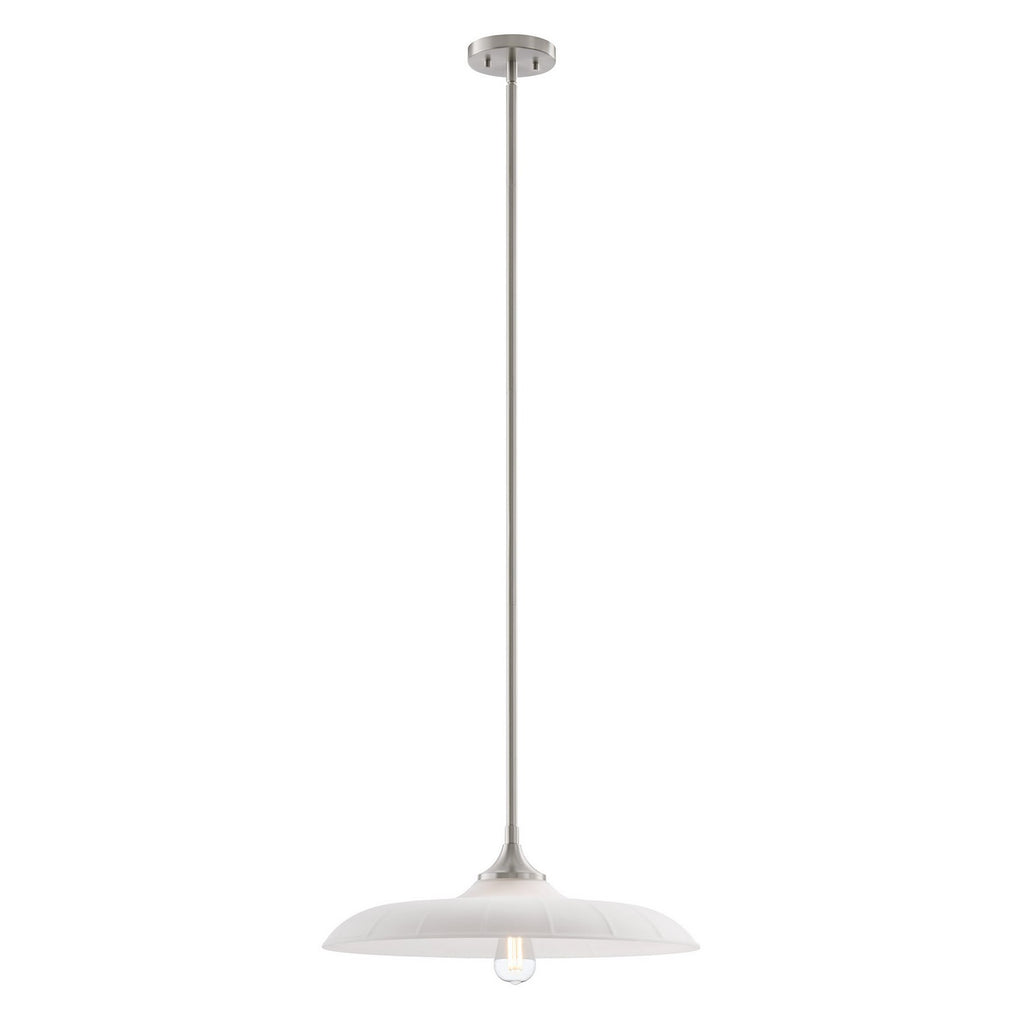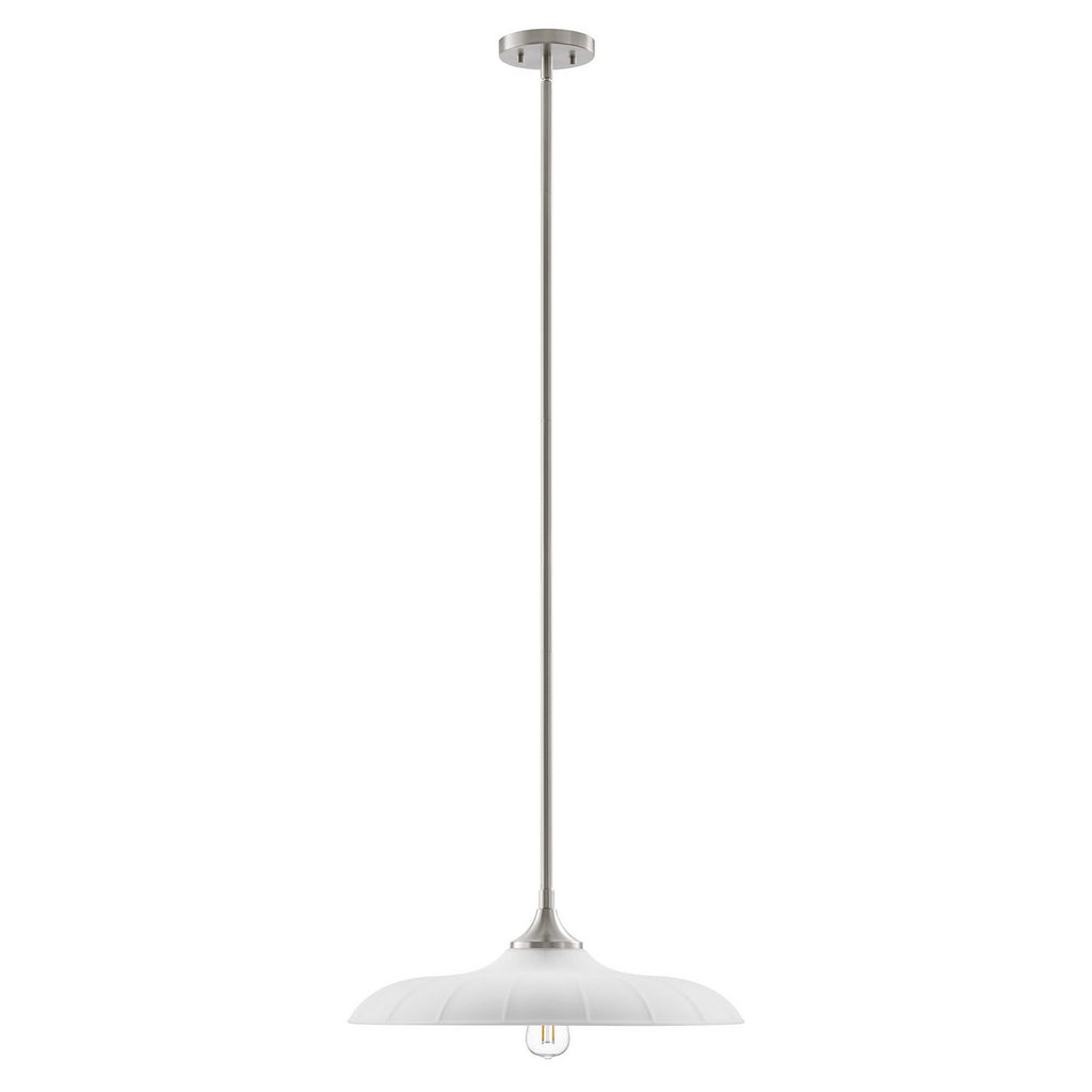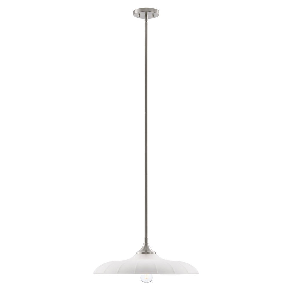 Welcome a look inspired by vintage workshop style with the Savoy House Hadley 1-light pendant. Its sleek, standout shade of subtly ribbed opal glass pairs beautifully with the Satin Nickel finish. Use it solo or in groupings for a big boost of appeal! Hadley is 20" in width and has an adjustable height ranging from 6.63" to 60.63". It uses one standard size bulb of up to 60 watts. Bulb not included. Comes with four 12" downrods and one 6" downrod.