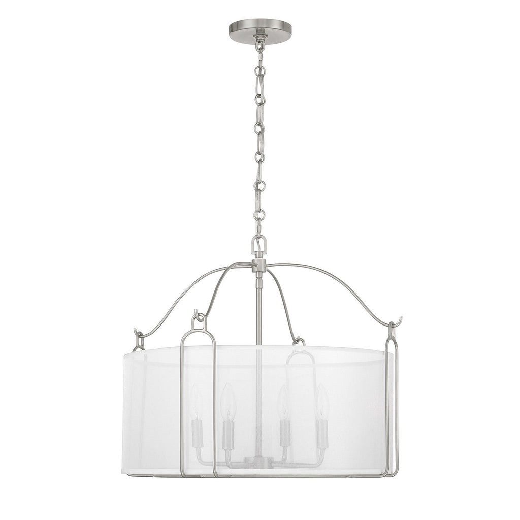 Create a soft and subtle glow with the Savoy House Ashlay 4-light pendant. Its drum shade of delicate organza is held in place on sleek and curving arms finished in Satin Nickel. Ashlay is 19" in height and 22" in width. Uses four candelabra size bulbs of up to 60 watts per bulb. Bulbs not included. Comes with 120" of chain.