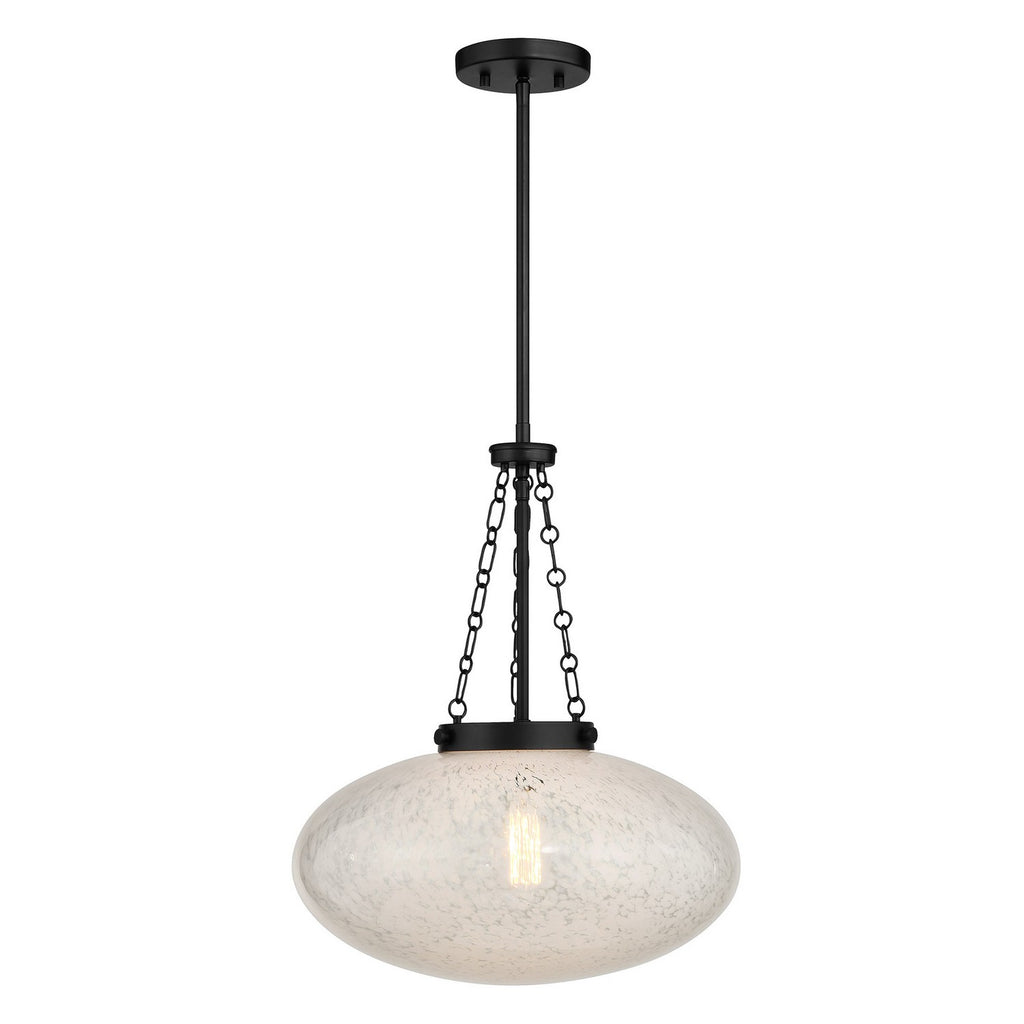 Get a bright and vintage-inspired look with the Savoy House Willow 1-light pendant. It has a mesmerizing, eye-catching oval shade of cloud glass, detailed hanging chain and a Matte Black finish. Willow is 16.5" in width and has an adjustable height ranging from 20.25" to 74.25". Uses one standard size bulb of up to 60 watts. Bulb not included. Comes with four 12" downrods and one 6" downrod.