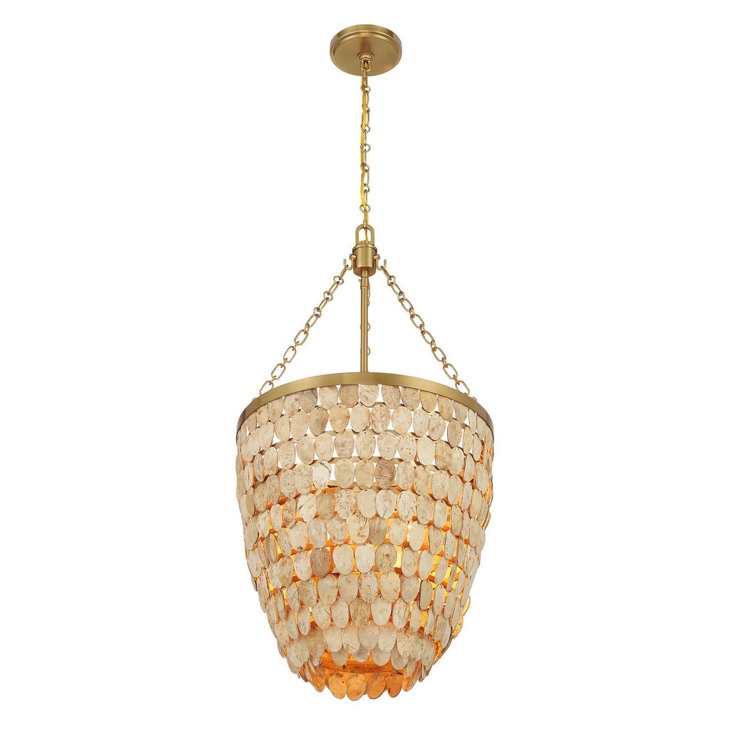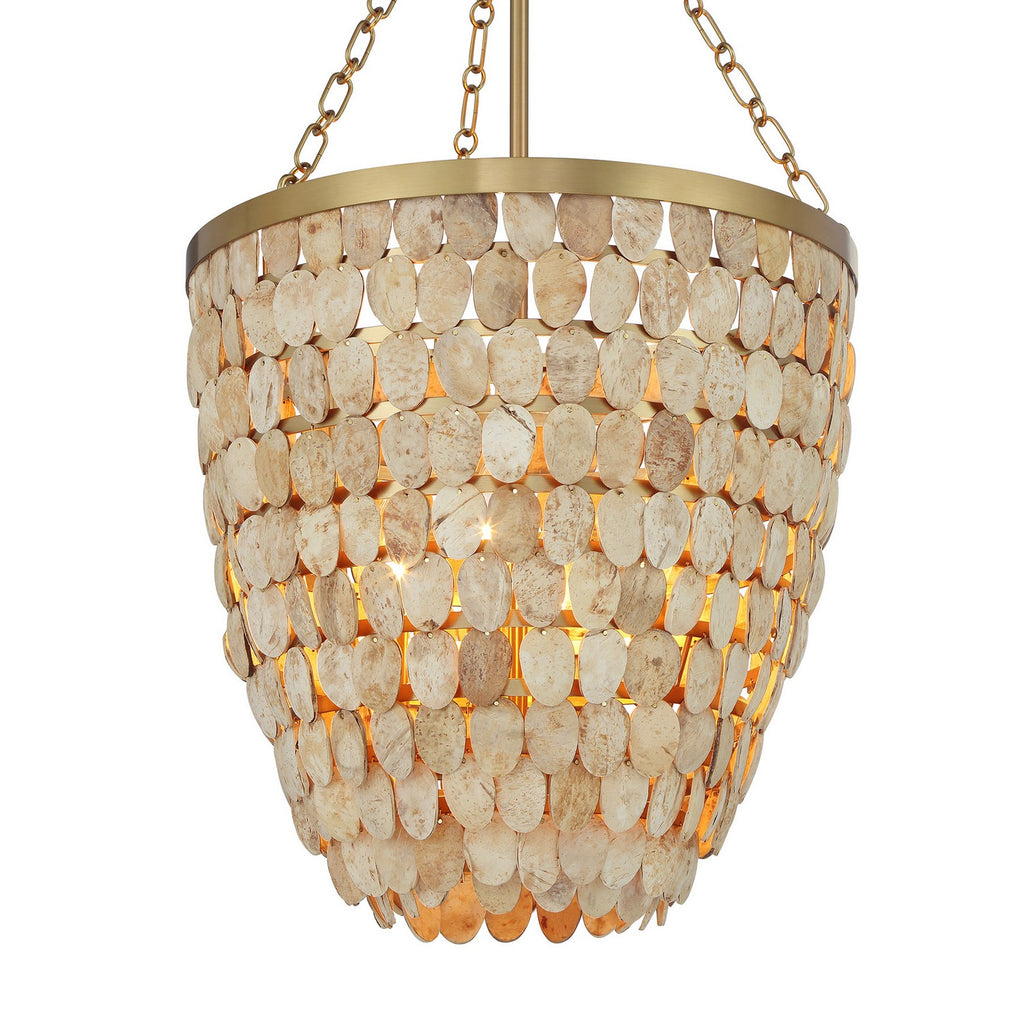 The Savoy House Catalan 4-light pendant was designed by award-winning interior designer and TV host Breegan Jane. It draws inspiration from the Mediterranean, a part of the world that Breegan treasures. A combination of fabulous French luxury and carefree island life culminates in this familiar yet fresh profile with a regal Warm Brass finish complemented by the organic appeal of the tiered coconut shells. Catalan is 31" in height and 16" in width. It uses four candelabra size bulbs of up to 60 watts per bulb. Bulbs not included. Comes with 120" of chain.