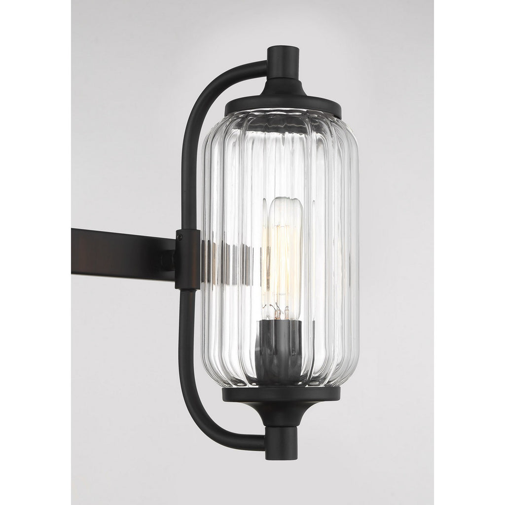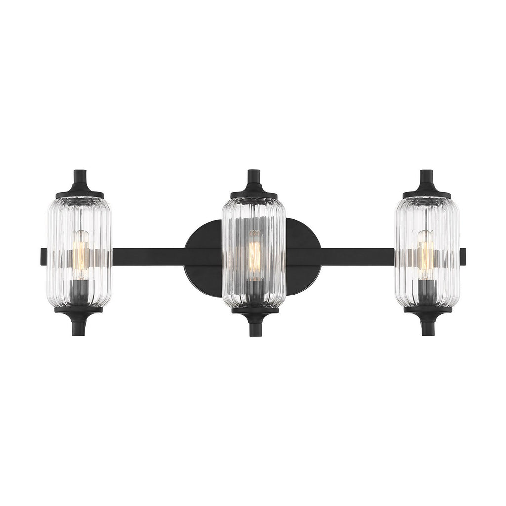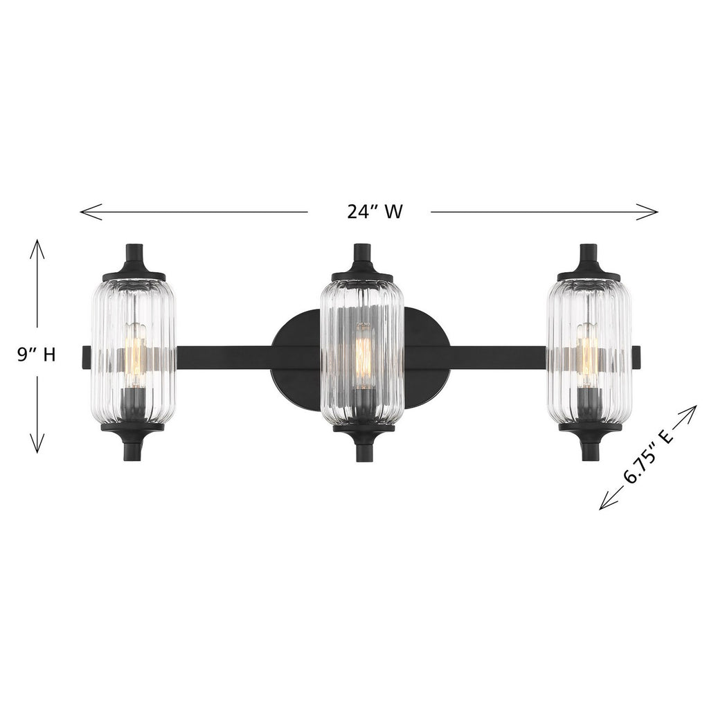 The Savoy House Holton 3-light bath light showcases an inventive and geometric style with tall, rounded shades of clear ribbed glass and a slim, rounded structure finished in Black. It will bring a big dose of style to any bathroom! Holton is 9" in height, 24" in width and extends 6.75" from the wall. It uses three candelabra size bulbs of up to 60 watts per bulb. Bulbs not included. Install as shown. This bath bar is damp area rated.