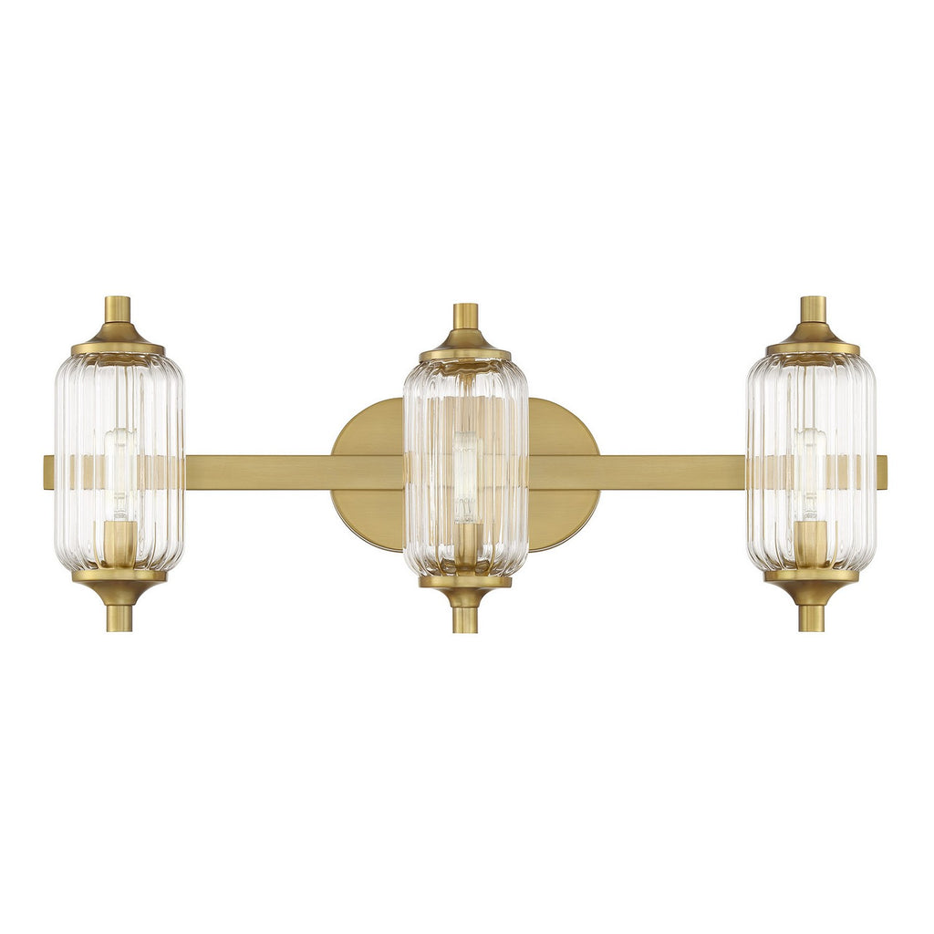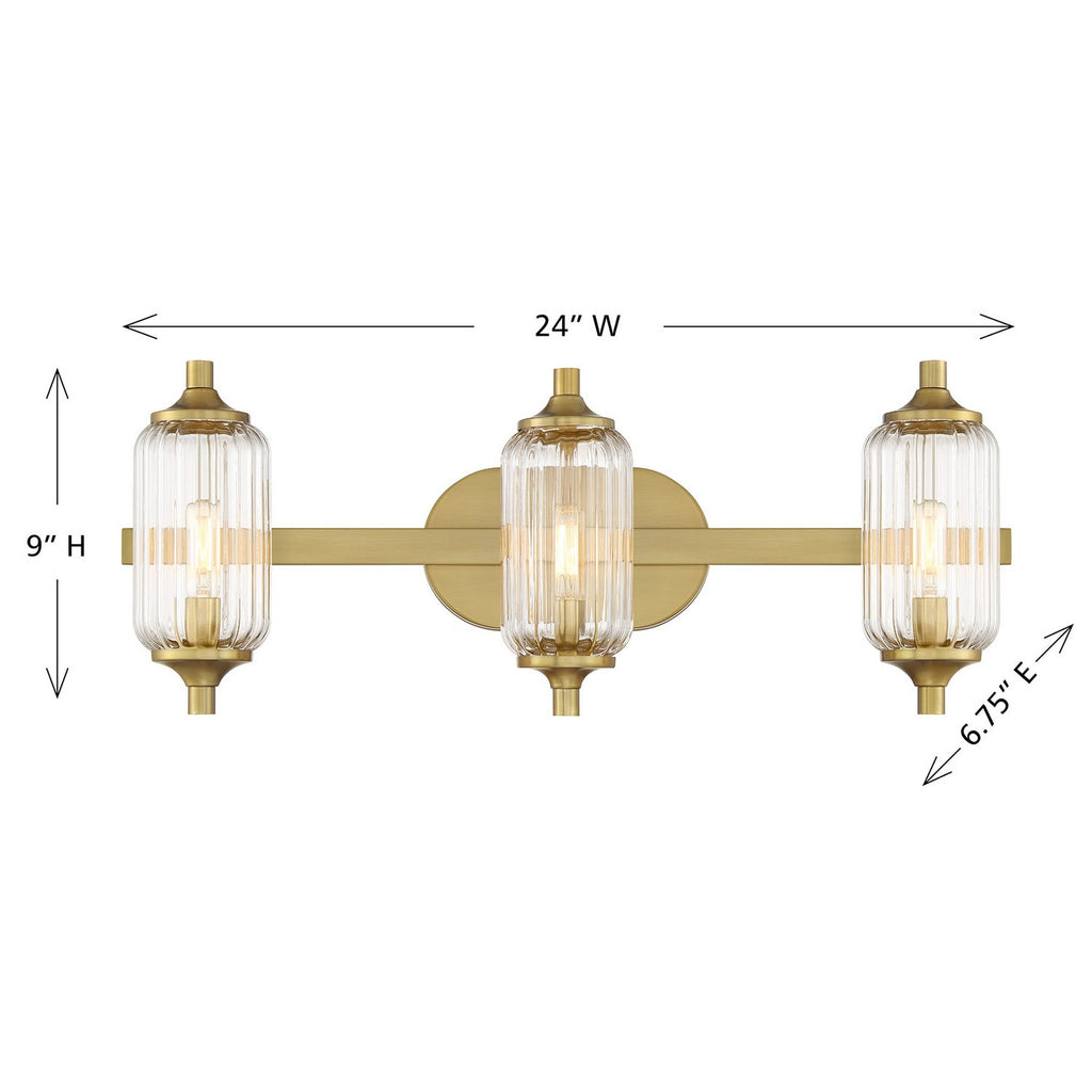 The Savoy House Holton 3-light bath light showcases an inventive and geometric style with tall, rounded shades of clear ribbed glass and a slim, rounded structure finished in Warm Brass. It will bring a big dose of style to any bathroom! Holton is 9" in height, 24" in width and extends 6.75" from the wall. It uses three candelabra size bulbs of up to 60 watts per bulb. Bulbs not included. Install as shown. This bath bar is damp area rated.