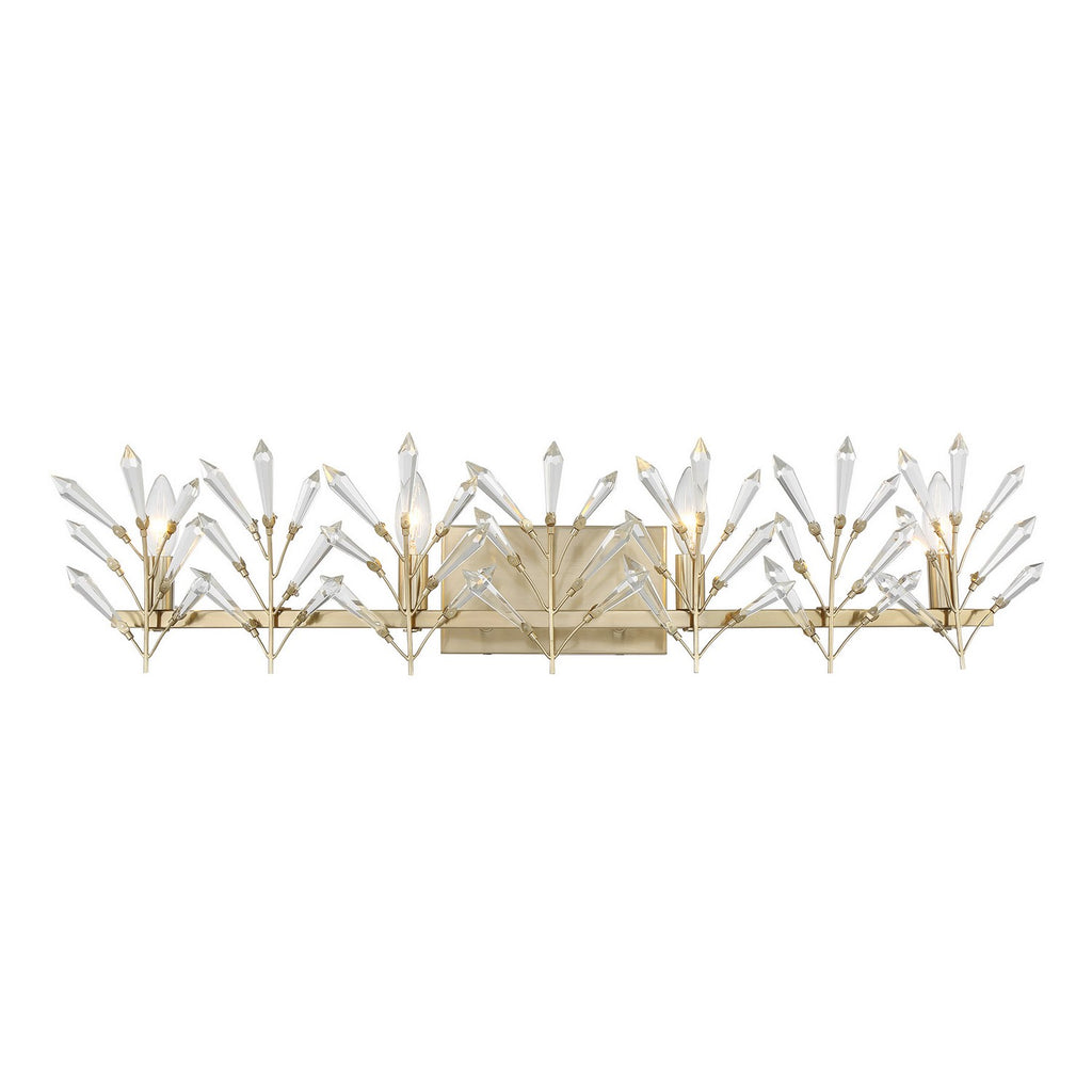 Decorate your home with the beautiful, nature-inspired Savoy House Orianna 4-light bath light. Its frame holds slim branches that are adorned with icicle-cut clear crystal accents. They glint and glimmer when illuminated and make a perfect match with the Noble Brass finish. Orianna is 8" in height, 33" in width and extends 7.5" from the wall. Uses four candelabra size bulbs of up to 60 watts per bulb. Bulbs not included. Mount as pictured. This bath bar is damp area rated.