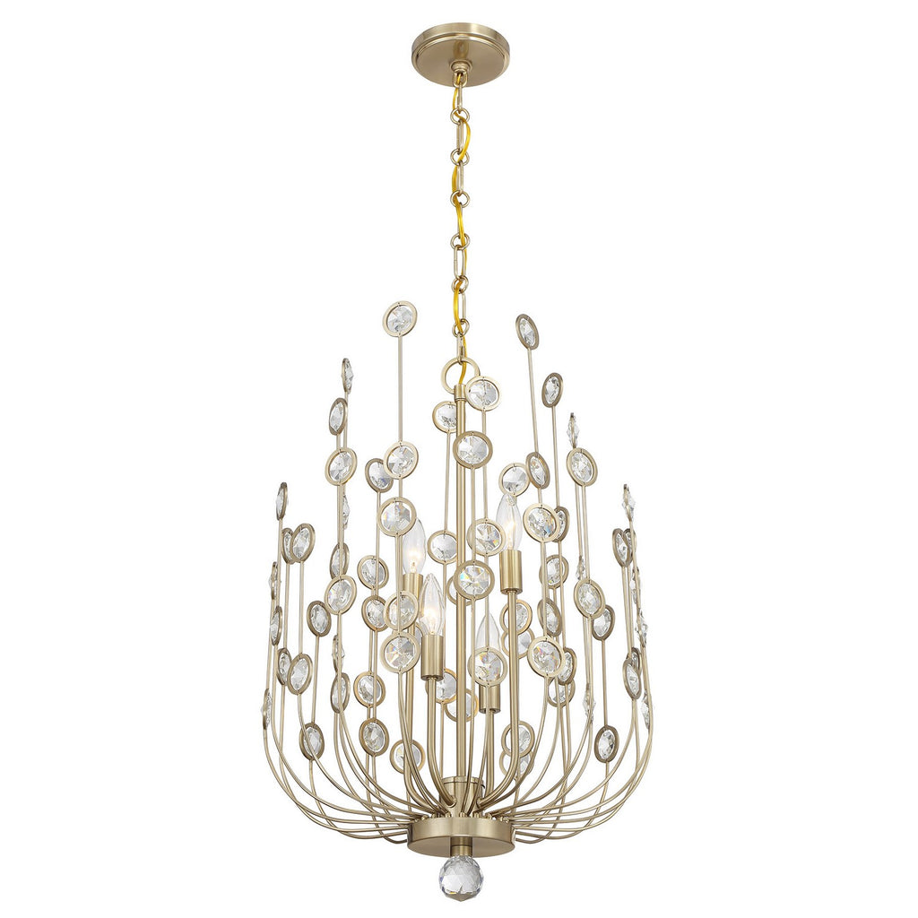 Unique, intriguing and eye-catching, the Savoy House Irina 4-light foyer light is sure to steal the show. Long, lean arms curve up and reach for the sky, finished in shimmering Noble Brass and adorned with octagons of faceted clear crystal held inside circular frames. Irina is 26" in height and 18" in width. Uses four candelabra size bulbs of up to 60 watts per bulb. Bulbs not included. Comes with 120" of chain.