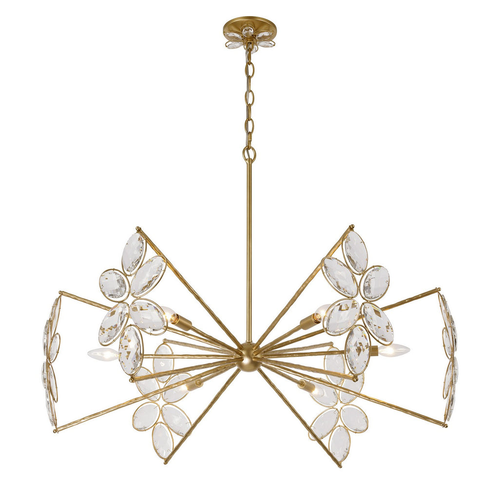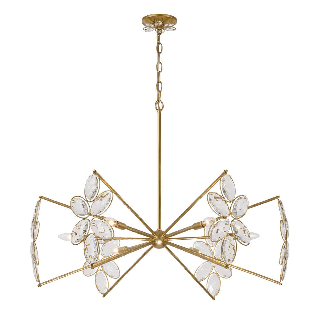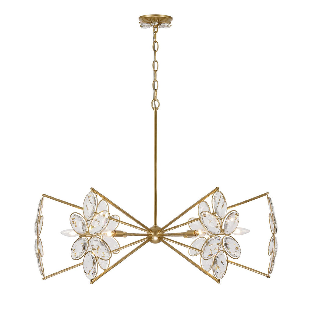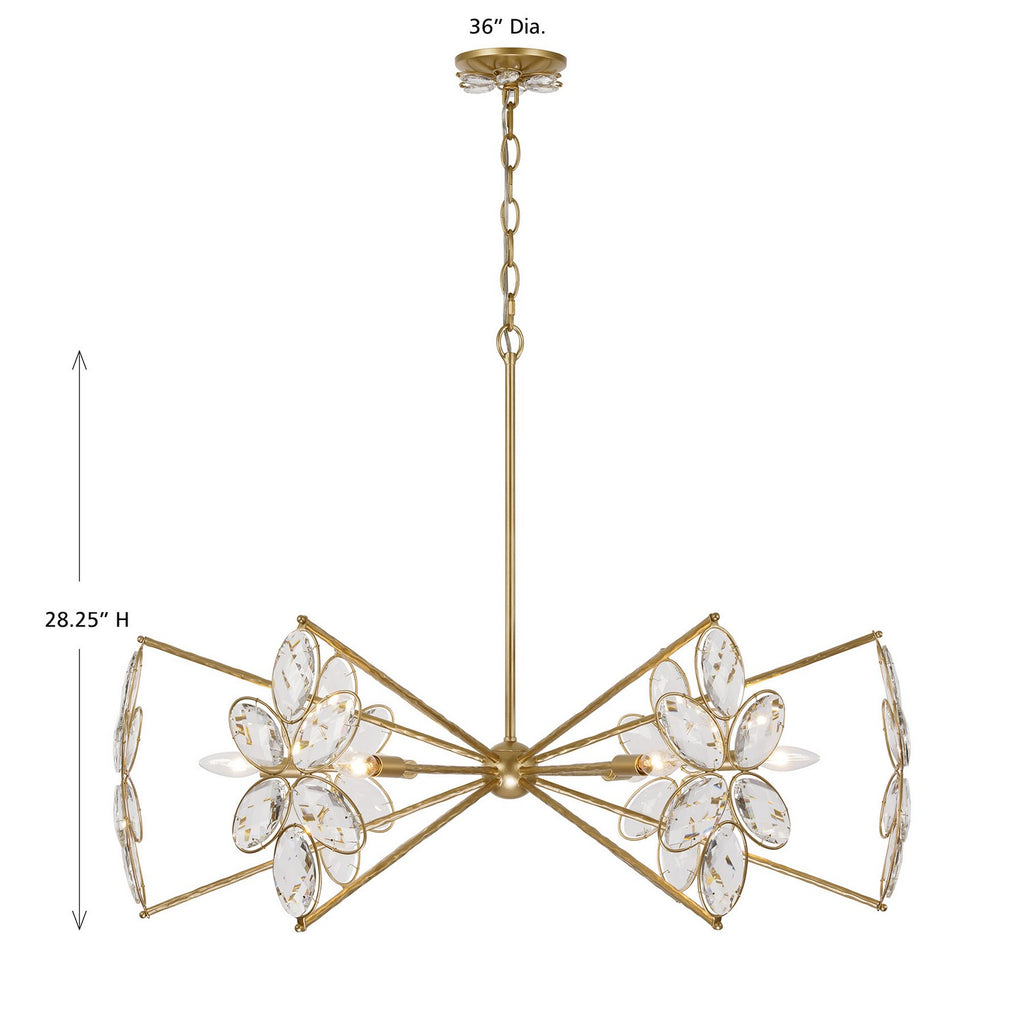 The Savoy House Marbella 6-light chandelier was designed by Breegan Jane, an award-winning interior designer and TV host. Breegan loves to travel to Spain and, accordingly, Marbella is named after a seaside Spanish city that boasts a significant archaeological heritage and pleasant coastal climate! This delicate, elegant design is decorated with sparkling K9 crystal flowers and finished in hand-applied Gold Shimmer. Marbella is 28.25" in height and 36" in width. It uses six candelabra size bulbs of up to 60 watts per bulb. Bulbs not included.