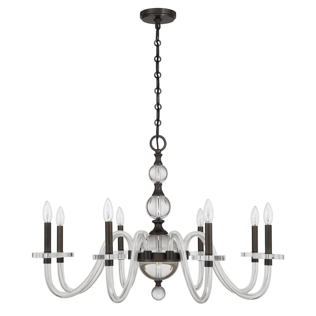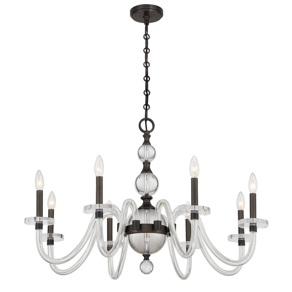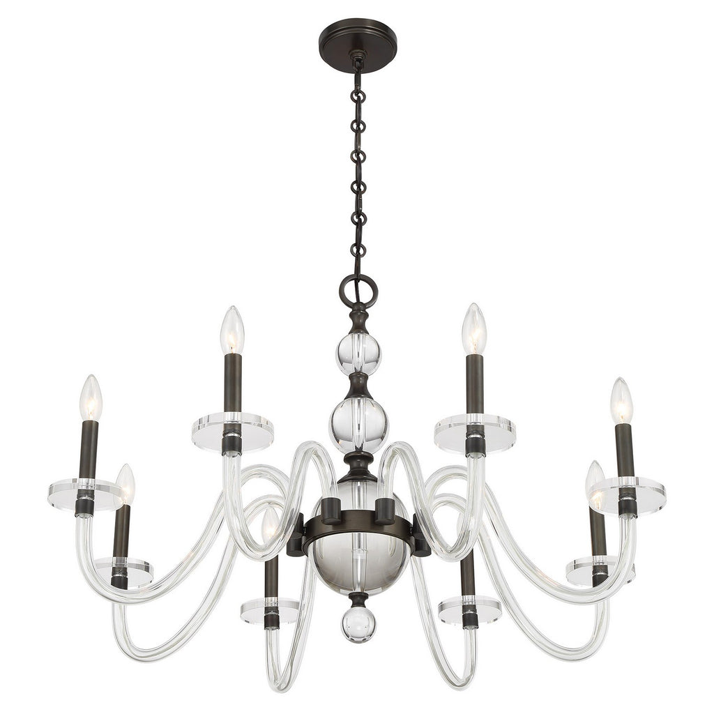 Bring the stately style of the Savoy House Aragon 8-light chandelier into your home and create a space fit for royalty! Its elegantly curving arms and parts of its center column are fashioned from clear glass, which modernizes a traditional silhouette, while the Mediterranean Bronze finish adds richness. Aragon is 22.75" in height and 34" in width. It uses eight candelabra size bulbs of up to 60 watts per bulb. Bulbs not included. Comes with 120" of chain.