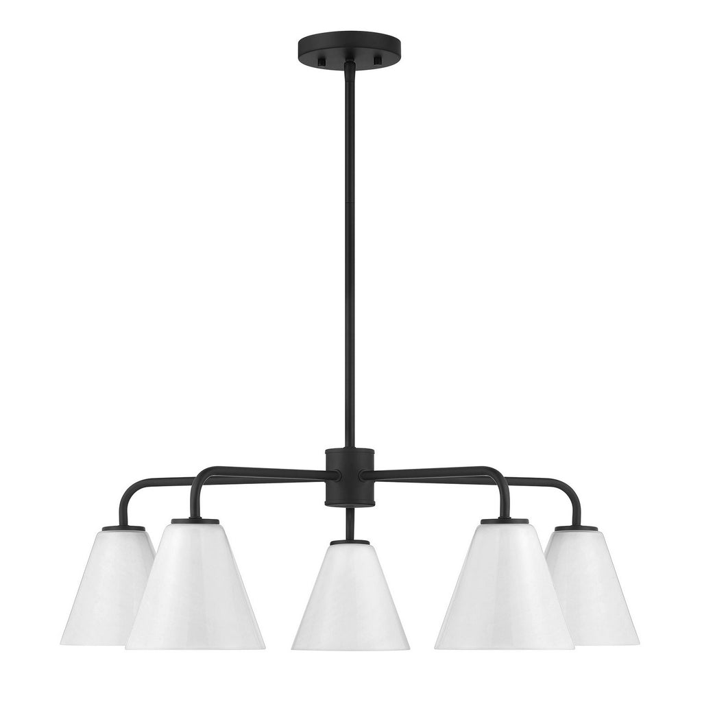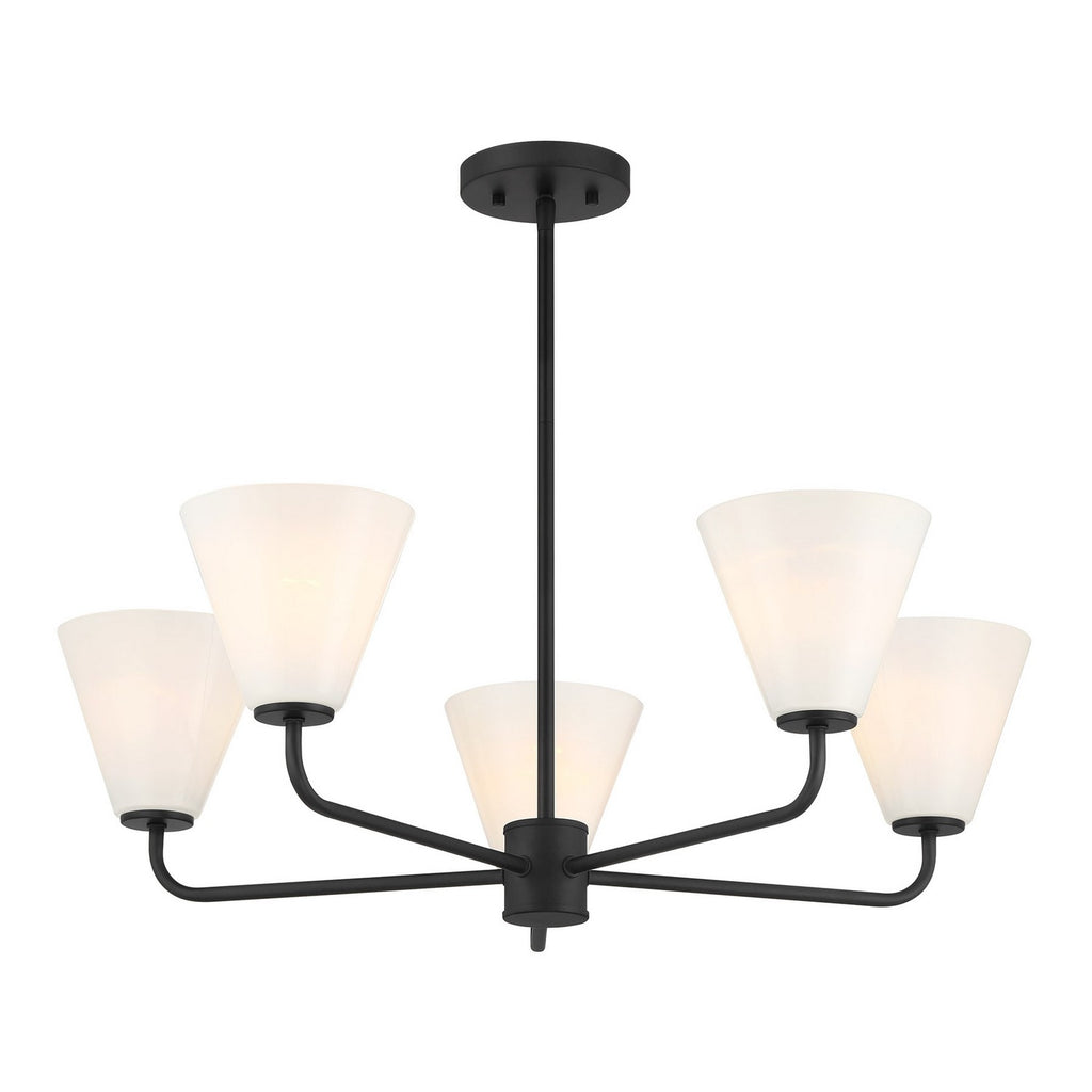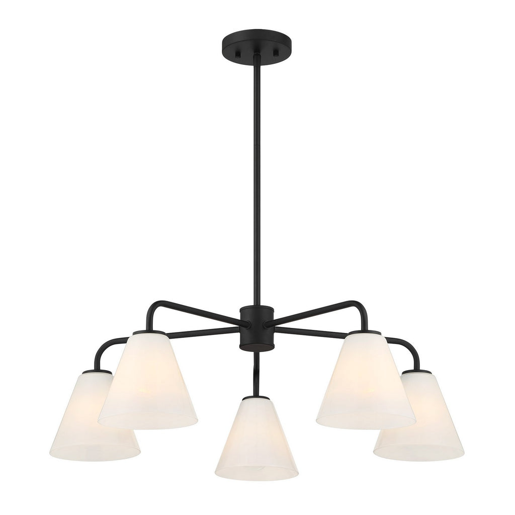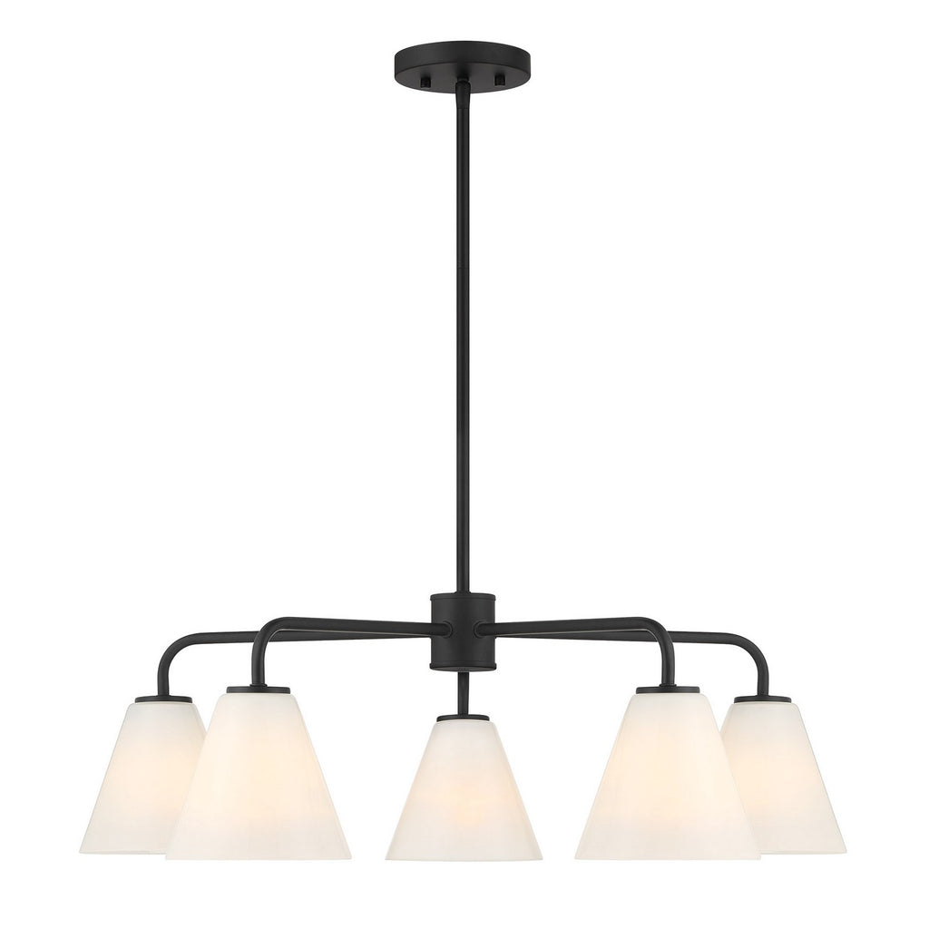 This Savoy House Blair 5-light chandelier is oh so versatile! It can be installed with the lights facing up or down, making it perfect for meeting every lighting need. Slender, sleek arms are finished in Matte Black and topped with shades of spectacularly swirling strie glass. Blair is 30" in width and has an adjustable height ranging from 9.25" to 63.25". Uses five standard size bulbs of up to 60 watts per bulb. Bulbs not included. Comes with four 12" downrods and one 6" downrod.