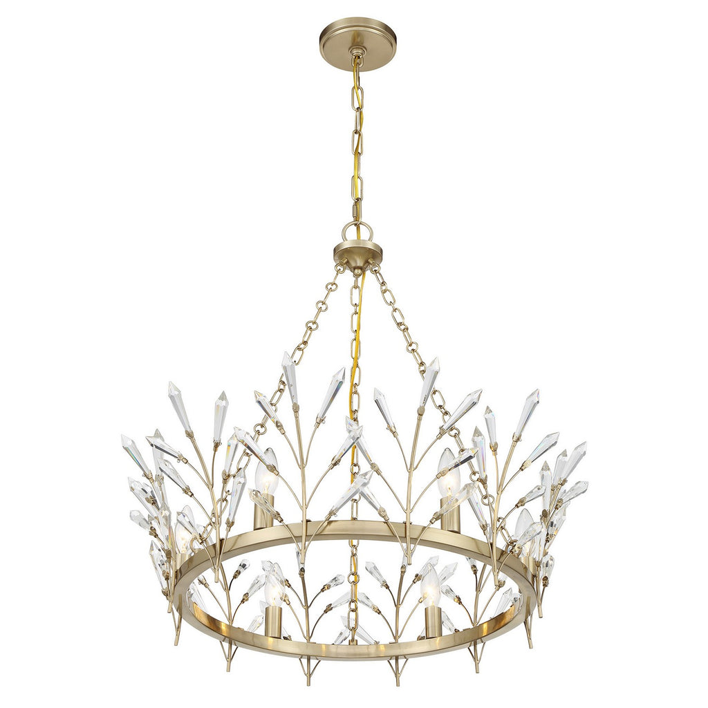 Crown your home with the beautiful tiara that is the Savoy House Orianna 6-light chandelier. Its round, open frame holds slim branches that are adorned with icicle-cut clear crystal accents. They glint and glimmer when illuminated and make a beautiful match with the Noble Brass finish. Orianna is 26" in height and 26" in width. It uses six candelabra size bulbs of up to 60 watts per bulb. Bulbs not included. Comes with 120" of chain.