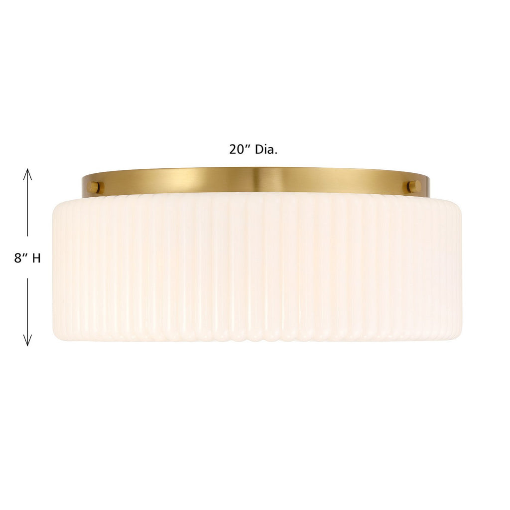 Use the vintage-inspired Savoy House Edgemont 4-light flush mount to add beautiful, vivid brightness to any room! The ribbed shade of strie glass brings in a big dose of eye-catching texture and the Warm Brass finish is extremely versatile. Edgemont is 8" in height and 20" in width, making it an excellent option for larger spaces. It uses four standard size bulbs of up to 60 watts per bulb. Bulbs not included.