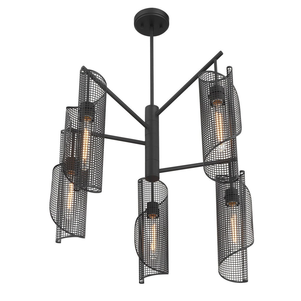 The Savoy House Hillbourne 5-light chandelier showcases ribbons of intriguing urban loft style. Its perforated metal shades, finished in Matte Black, appear to swirl and twirl beautifully. The lights hang down at different heights for added motion and intrigue. Hillbourne is 28" in width and has an adjustable height ranging from 25" to 79". Uses five standard size bulbs of up to 60 watts per bulb. Bulbs not included. Comes with four 12" downrods and one 6" downrod.