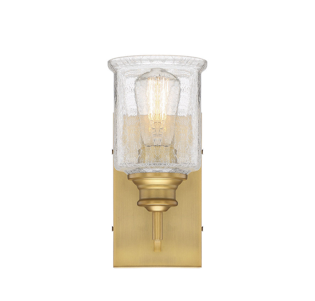 The stunning shade of thick clear crackle glass is the star of the Savoy House Hampton 1-light wall sconce. So as to let the star have center stage, the rest of the structure is kept deliberately understated. This makes it perfectly versatile for many different spaces and uses, ranging from lighting a hallway to boosting the illumination in a living room and much more. Offered in a rich warm brass finish. This fixture is 4.75" wide and 9.88" tall. It extends 6.5" from the wall. Uses a standard size bulb of up to 60 watts (not included).