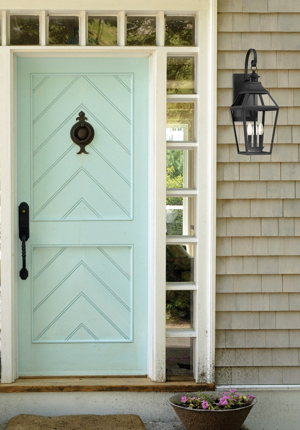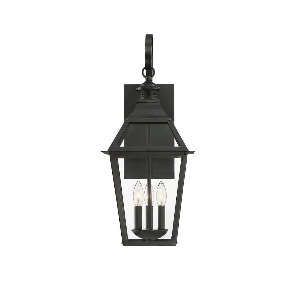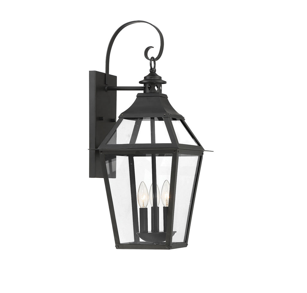This Savoy House Jackson 3-light outdoor wall lantern is the perfect way to easily boost your home's curb appeal. It is crafted in a classic, timeless style with boldly angled curves, eye-catching pierced metal detail and a dramatic shepherd's hook. Panes of clear glass ensure a bright, beautiful glow and a generously sized backplate will help to cover any holes left from replacing previous fixtures. Jackson is finished in black with gold highlights to go well with anything and add a touch of glamour. Use this lantern beside your front and side doors or above your garage door. This fixture is 10.88" wide and 25.5" tall. It extends 11.75" from the wall. Uses 3 candelabra size bulbs of up to 40 watts each (not included).