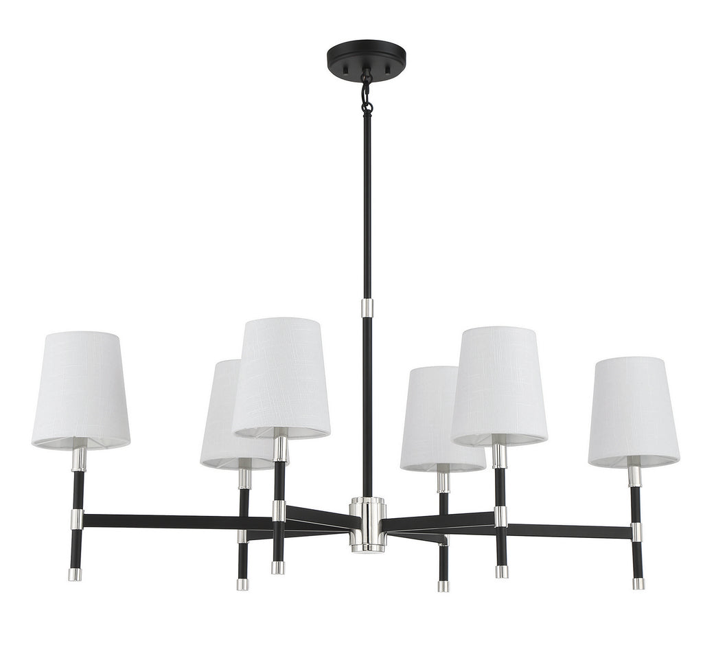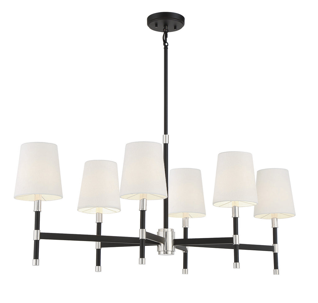 The Savoy House Brody 6-light linear chandelier is a great way to infuse your home with sophisticated lighting style. Its streamlined classic look is decorated with white fabric shades and finished in matte black with shining polished nickel accents. It's perfect for brightening up any room! Brody is 41" in length and 18" in width. It has an adjustable height ranging from 24" to 70". It uses six candelabra size bulbs with a max of 60 watts per bulb. Comes with four 12" downrods and one 6" downrod, plus 80" of cord.