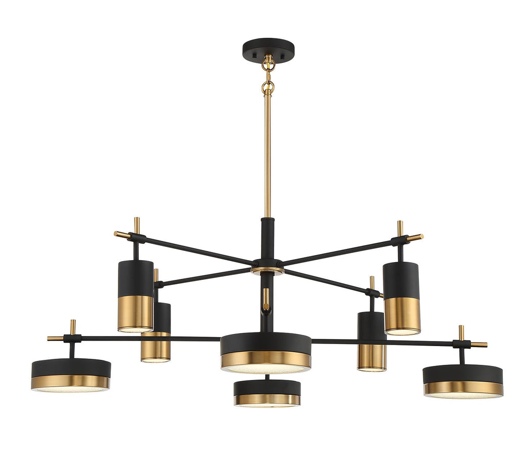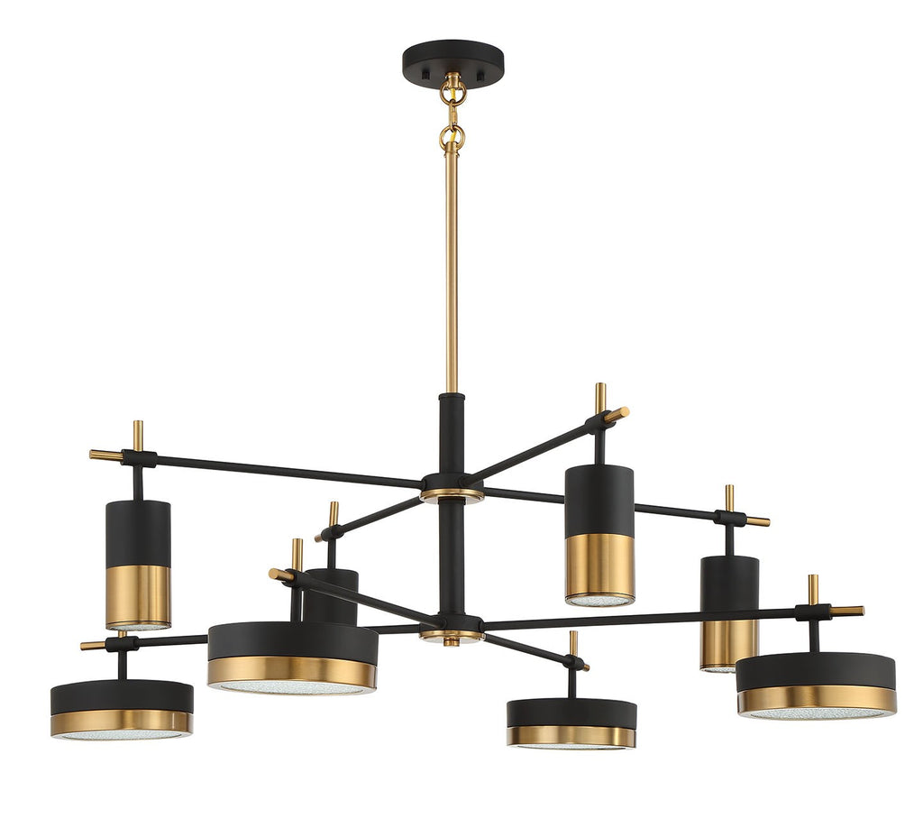 Substantial in size and style, the Savoy House Ashor 8-light chandelier is designed to beautify large spaces with its geometric look and two-tone finish. Sparkling faceted crushed crystal inside each light, illuminated by integrated LED, will truly wow anyone who sees it. Ashor is 42" in width and has an adjustable height ranging from 21" to 67". Comes with four 12" downrods and one 6" downrod, plus 80" of cord.