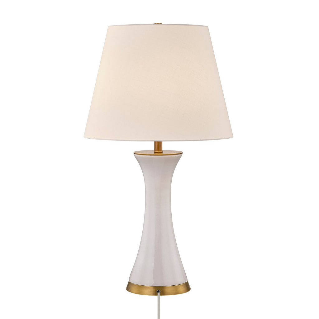 This elegantly curving ceramic Coco & Dash Dana table lamp, accentuated by plated brass detailing and a white fabric shade, brings a terrifically timeless lighting look to any room. It is 32" in height and 18" in width. It uses one standard size bulb of up to 100watts. Bulb not included.