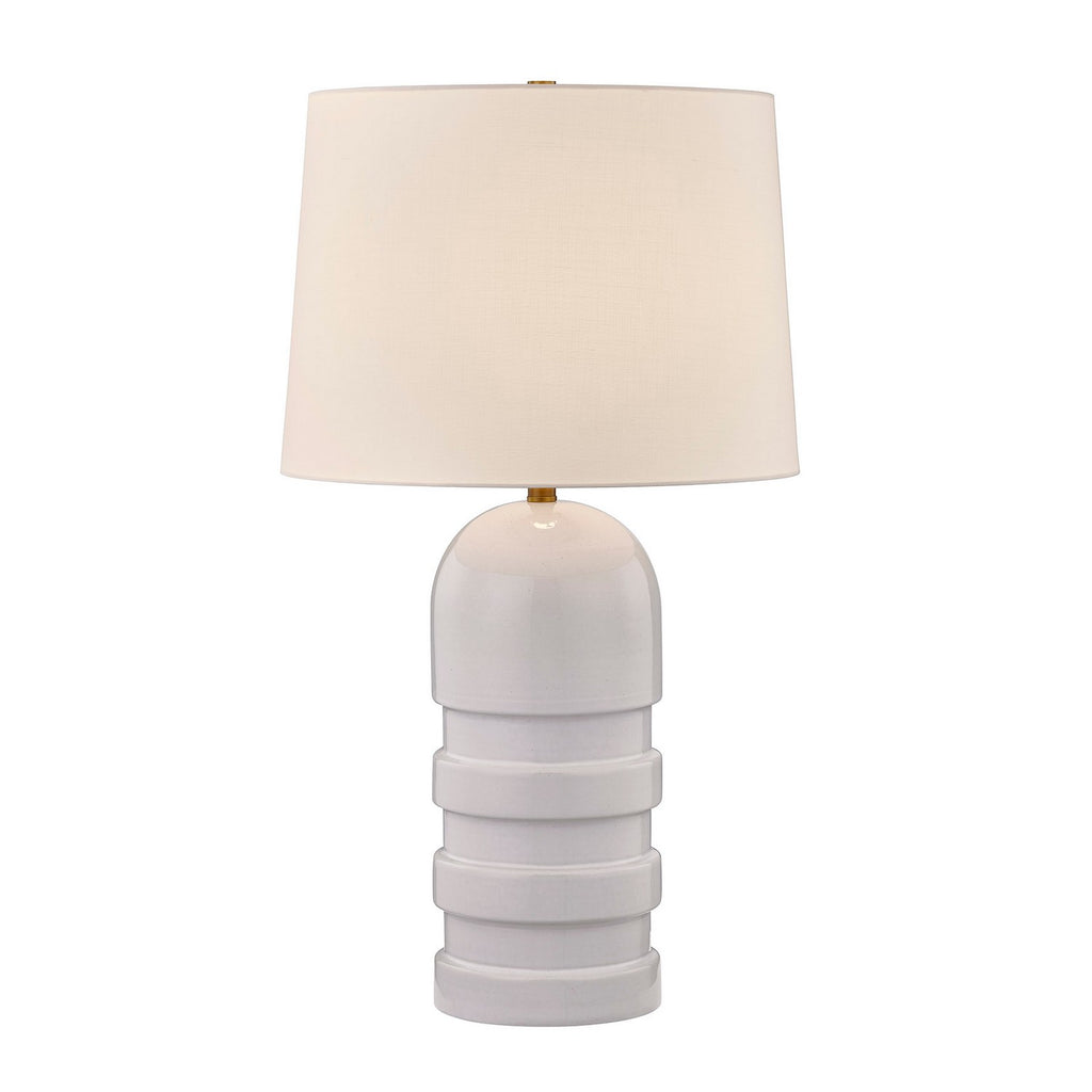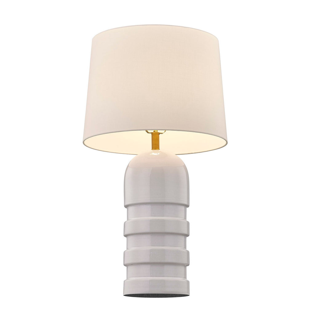 Make a bold style statement with this stunning Coco & Dash Wehunt table lamp, which showcases an almost bullet-like ceramic structure that is finished in White and topped off with a white fabric shade. This lamp is 32" in height and 18" in width. It uses one standard size bulb of up to 100 watts. Bulb not included.