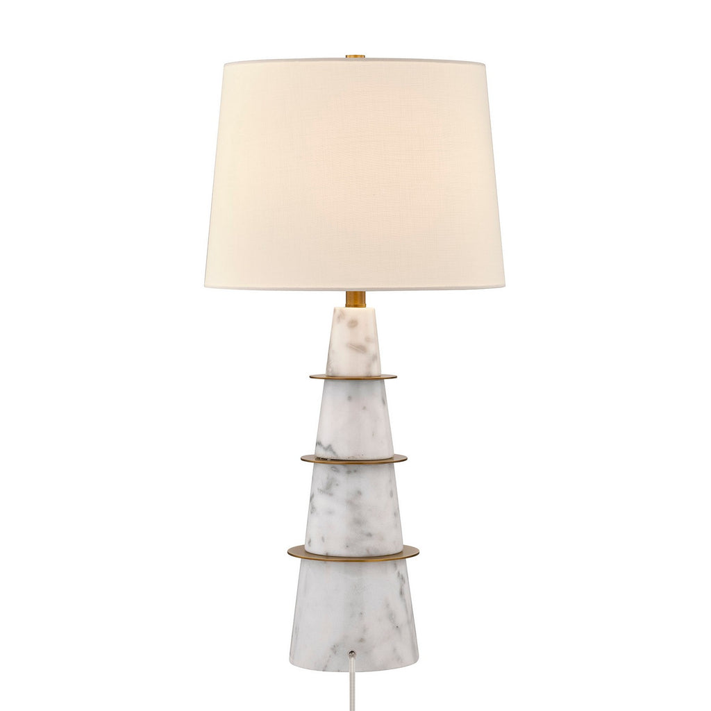 There is nothing quite like the timeless beauty and uniqueness of stone. This Duffield table lamp by Coco & Dash showcases stone in a conical body of marble, accentuated by a white fabric shade and three discs of plated brass that add another dimension of texture and finish. This lamp is 30" in height and 16" in width. It uses one standard size bulb of up to 100 watts. Bulb not included.