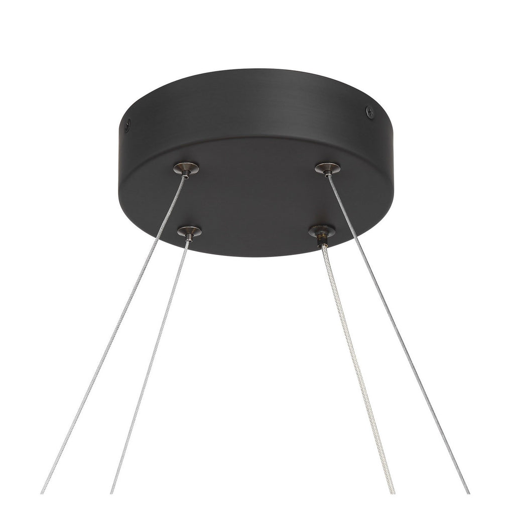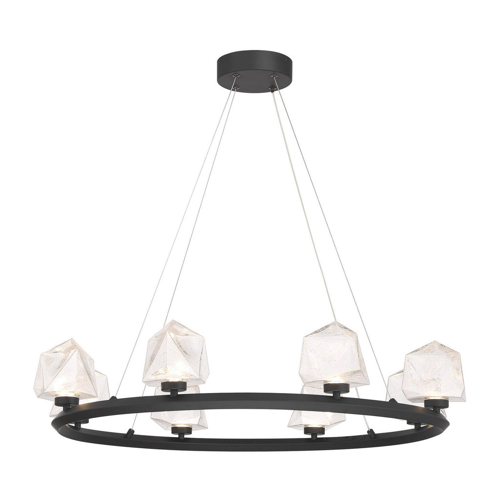 The Castello 8-light chandelier from Savoy House is cool as ice! Its sharply cut shades of clear hammered glass add a bright touch of geometry and texture, pairing perfectly with the thick hoop-shaped structure that is finished in Matte Black. When the glass is illuminated by the integrated LED light sources, it will truly shine. Super slender hanging cords ensure that your attention stays on the sleek, contemporary design. Castello is 33.63" in width and has an adjustable height ranging from 6" to 126".