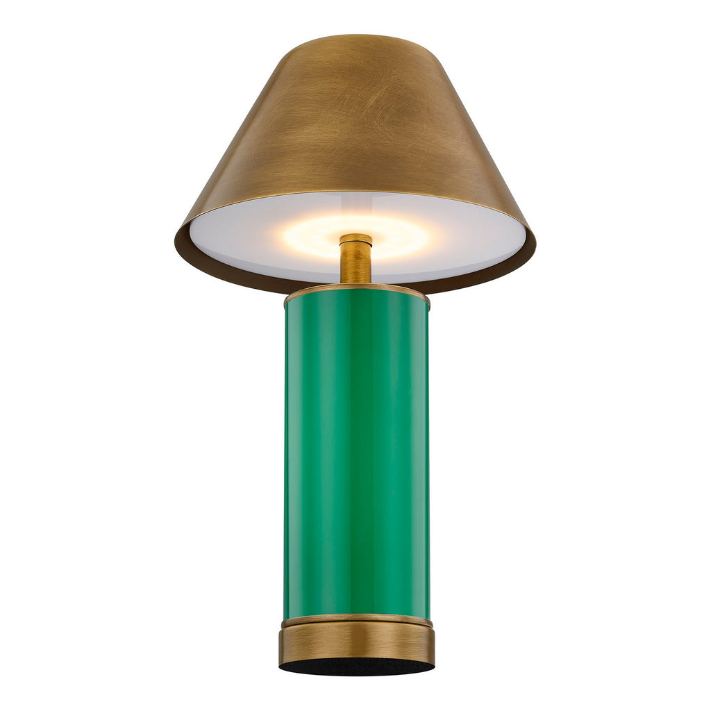 This chic Molly table lamp from Coco & Dash is portable and rechargeable, giving you a glow that can go anywhere! A plated brass shade adds classic charm, and the integrated LED light source brings bright, crisp illumination. Tap directly on the top center of the shade to switch the light on or off. Finished in candy-colored Jolly Green. This lamp is 12" in height and 7" in width. It gives off 240 lumens at a 3000K color temperature.