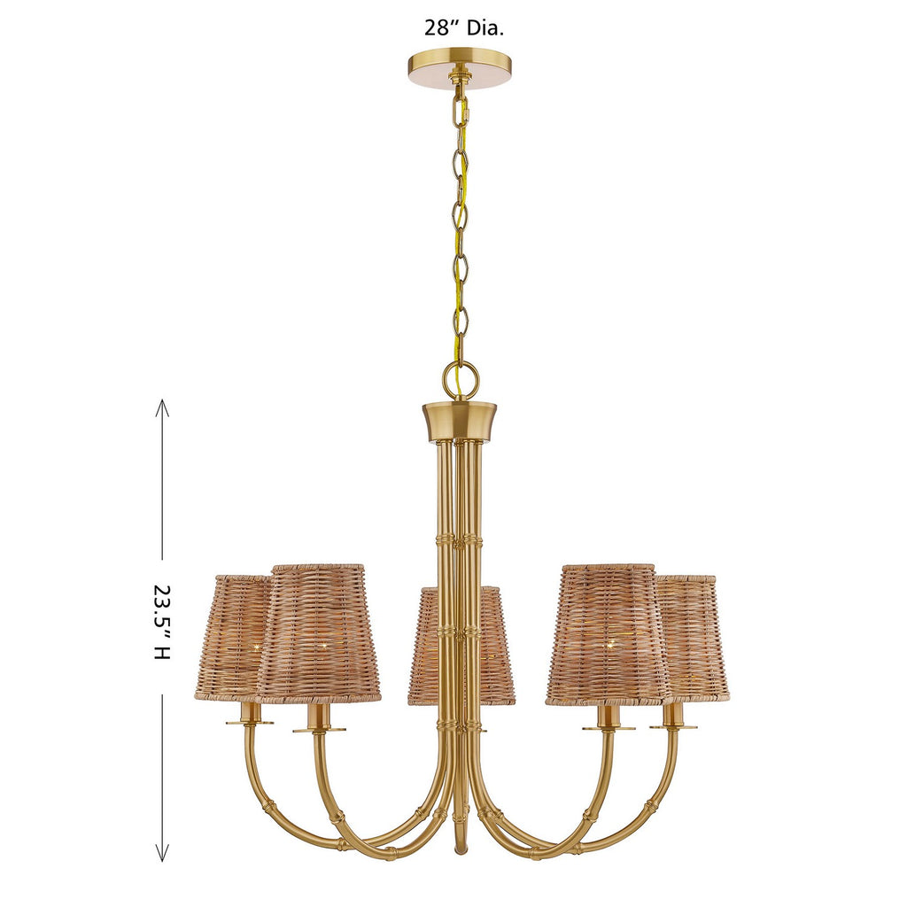 Find fabulous organic allure with the Savoy House Ashbury 5-light chandelier! Bamboo-inspired detailing on the arms and center column matches up nicely with the textured rattan shades to bring a relaxed natural style to any space. The Warm Brass finish adds a glamorous touch. Ashbury is 23.5" in height and 27.5" in width. It uses five candelabra size bulbs of up to 60 watts per bulb. Bulbs not included. Comes with 120" of chain and 144" of cord.