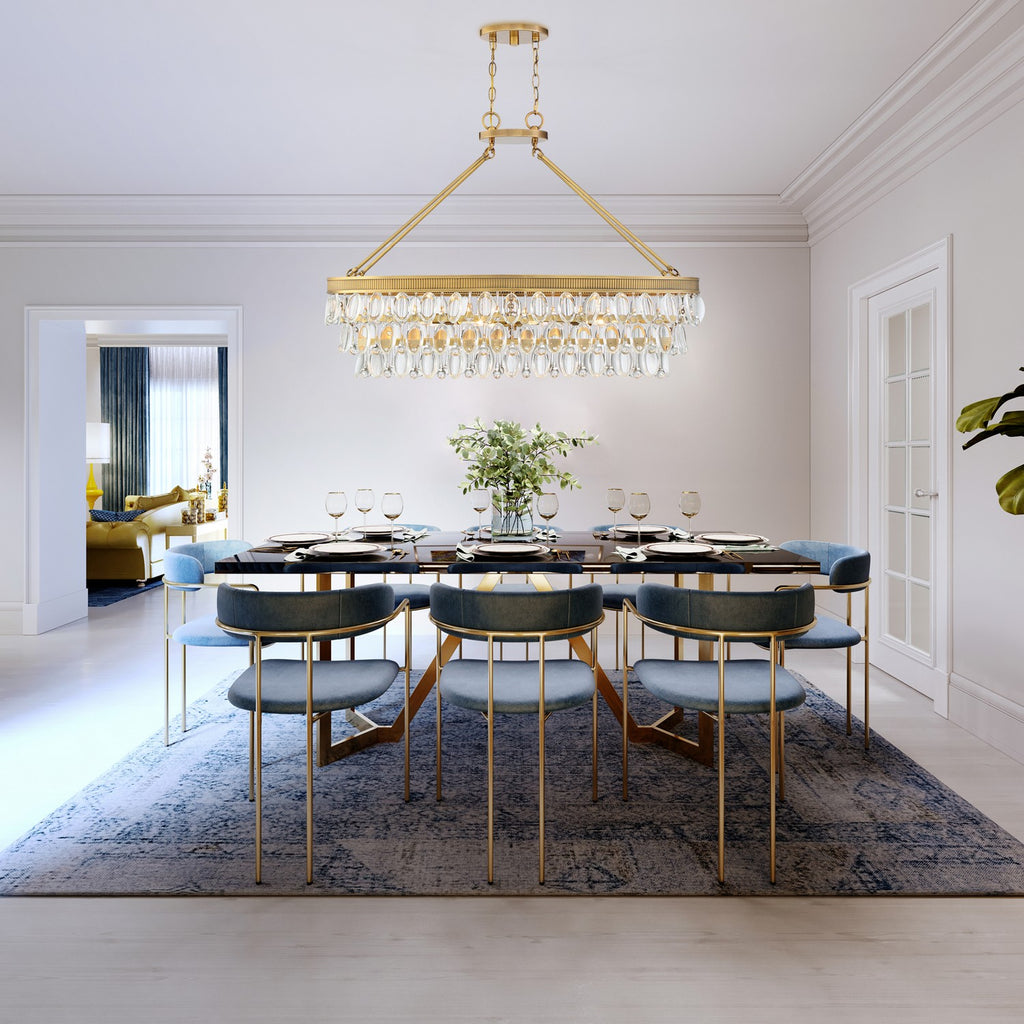 The Savoy House Windham is a glamorous modern chandelier that brings a touch of luxury and elegance to your home. The textured, elongated oval band of the frame, downrods and disc-shaped canopy are all finished in warm brass. The frame holds three descending tiers of gorgeous clear crystals with alternating oval and teardrop shapes that add wonderful texture and sparkle. Eight candelabra bulbs within provide beautiful illumination, making Windham a stunning choice for your glam, contemporary or transitional decor style. The chandelier is 38" long, 16" wide and 26" high, creating a linear shape that's perfect for gathering areas in your dining room, living room, great room, kitchen island, hallway or family room.