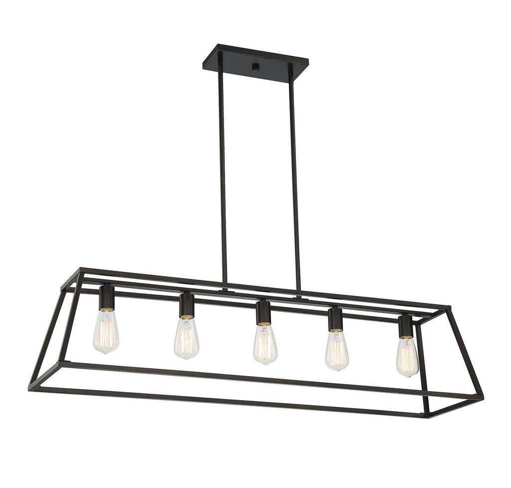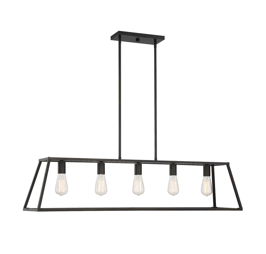 Clean, sophisticated lines define the timeless style of this Denton 5-light linear chandelier. The classic geometric shape creates a harmonious mood and the open frame has a splendid, sleek profile that blends easily with multiple decor styles. Finished in classic bronze. Five standard size 60W bulbs shine through the open framework, casting perfect light. At 45" long and linear in shape, the Denton is an ideal fit for dining areas, kitchen islands, breakfast bars, foyers, living rooms, over bathroom vanities, dressing rooms and in many other work or gathering areas.