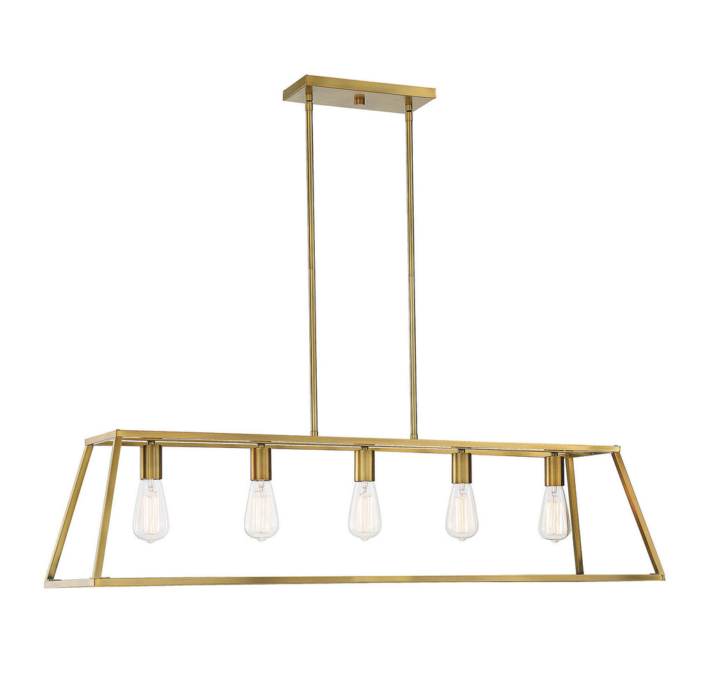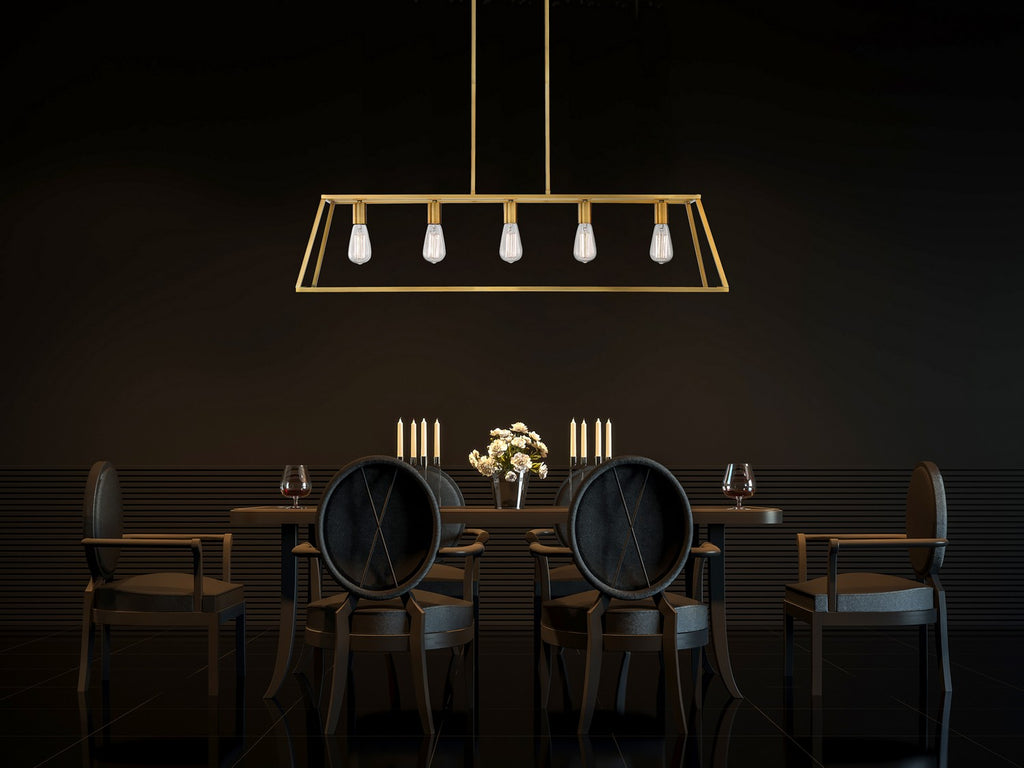 Clean, sophisticated lines define the timeless style of this Denton 5-light linear chandelier. The classic geometric shape creates a harmonious mood and the open frame has a splendid, sleek profile that blends easily with multiple decor styles. Finished in warm brass. Five standard size 60W bulbs shine through the open framework, casting perfect light. At 45" long and linear in shape, the Denton is an ideal fit for dining areas, kitchen islands, breakfast bars, foyers, living rooms, over bathroom vanities, dressing rooms and in many other work or gathering areas.