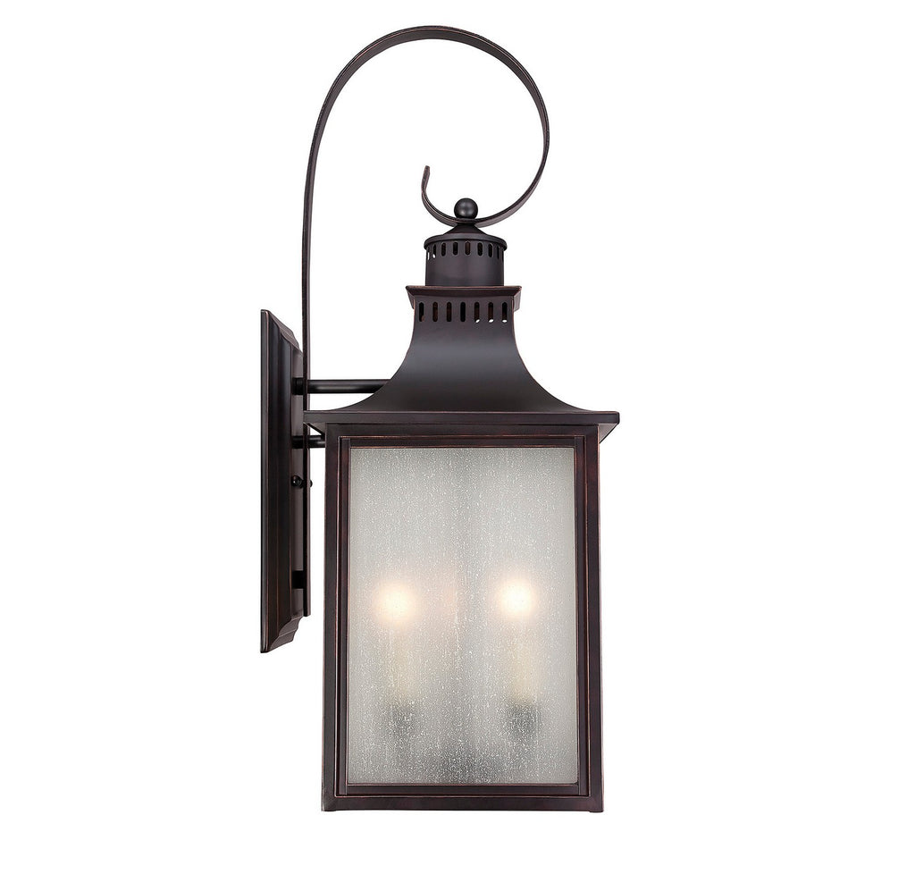 The Savoy House Monte Grande 3-light outdoor wall lantern is an elegant, clean-lined version of a classic box-shaped lantern. It's a timeless and pleasing style from designer Karyl Pierce Paxton, a wall lantern that will illuminate the exterior of your home and welcome you and your guests with a familiar, traditional aesthetic. The English bronze finish is a wonderful neutral and the panels are made of beautiful pale cream seeded glass. Three 40W candelabra size bulbs provide plenty of soft light. This lantern is 10" wide, 26.75" high and UL rated for wet locations.