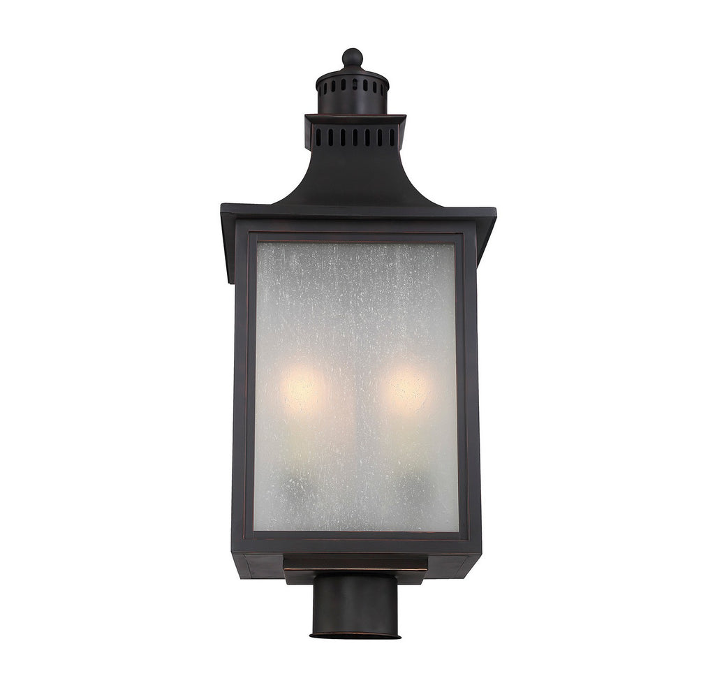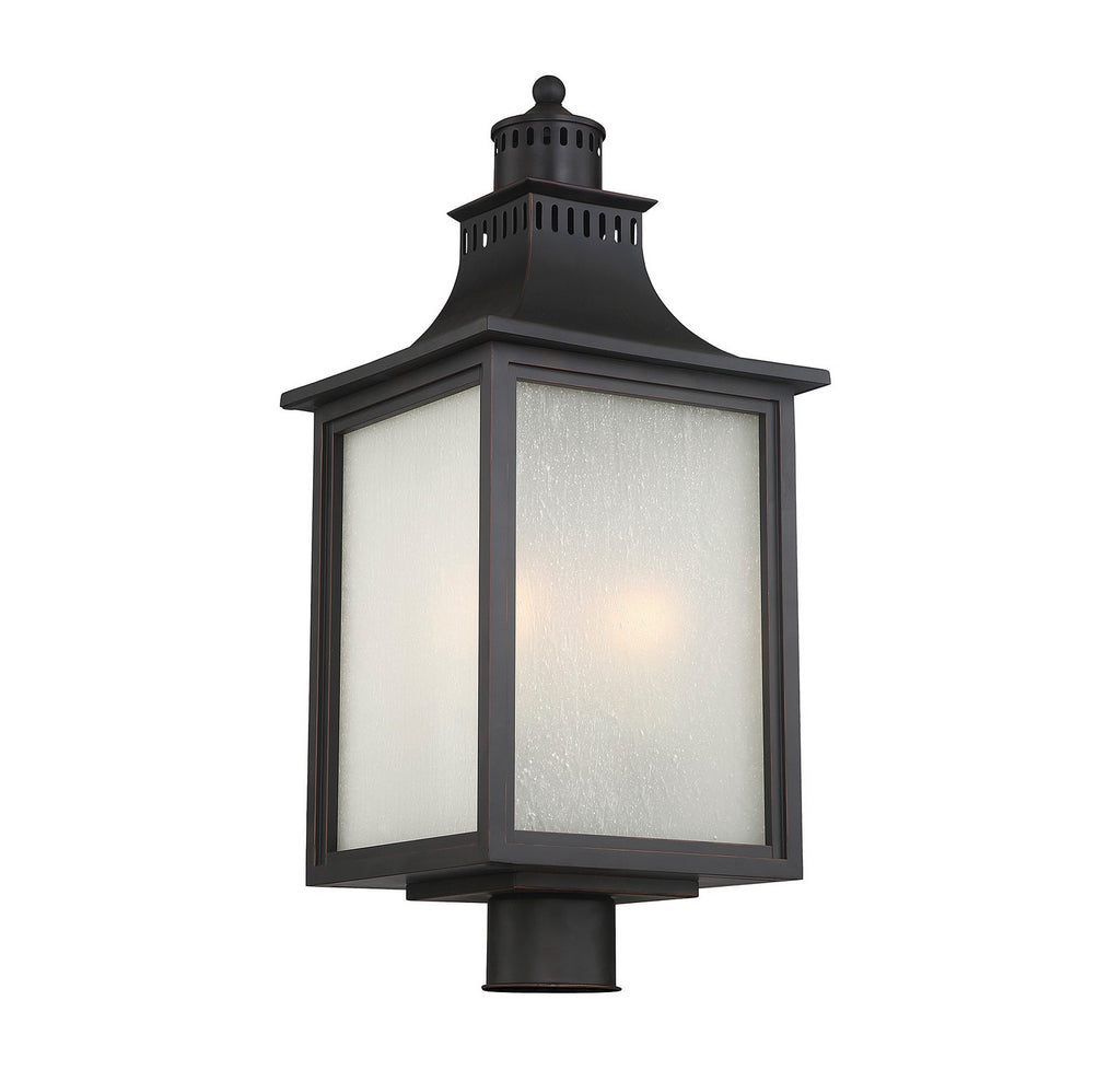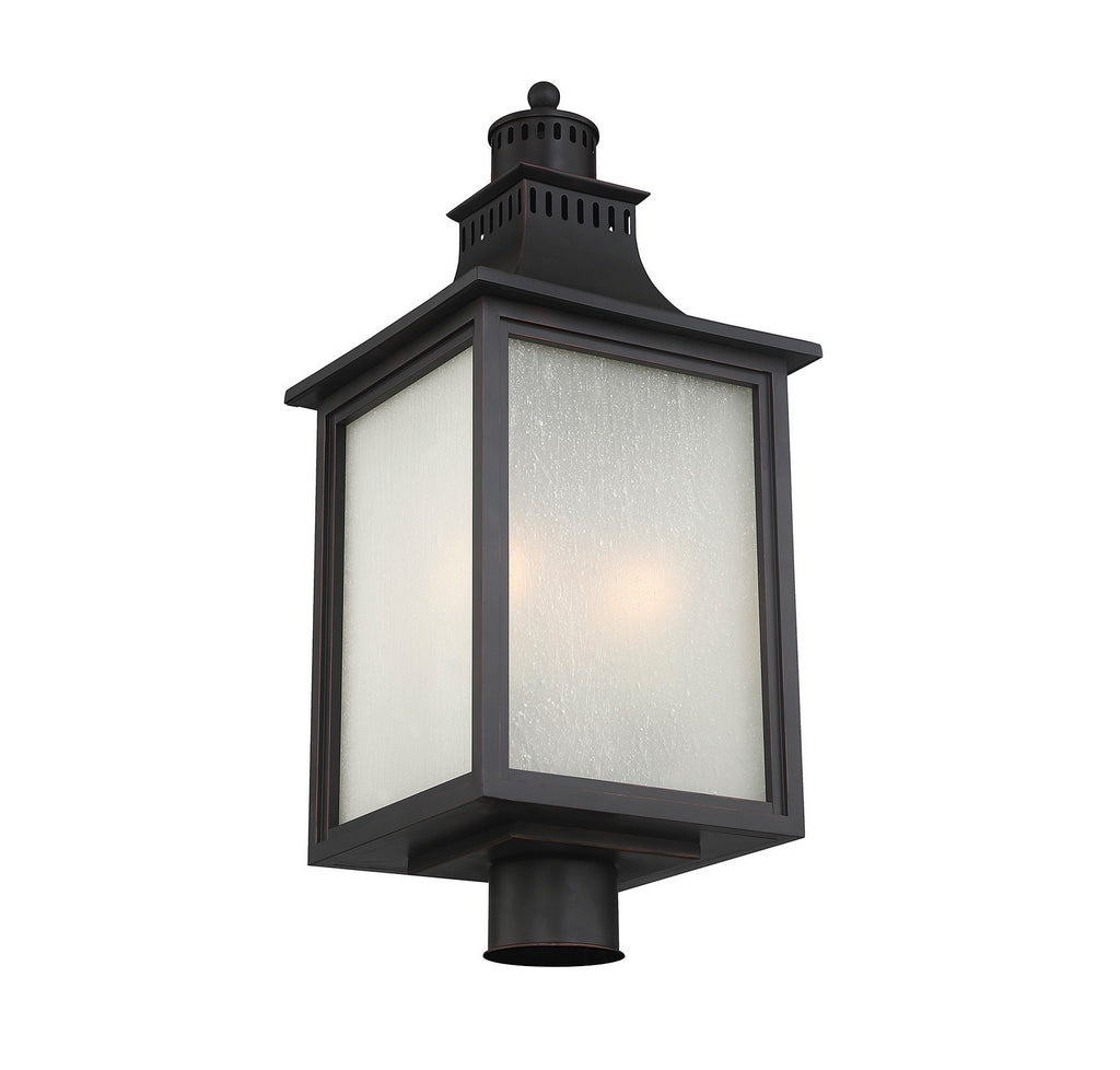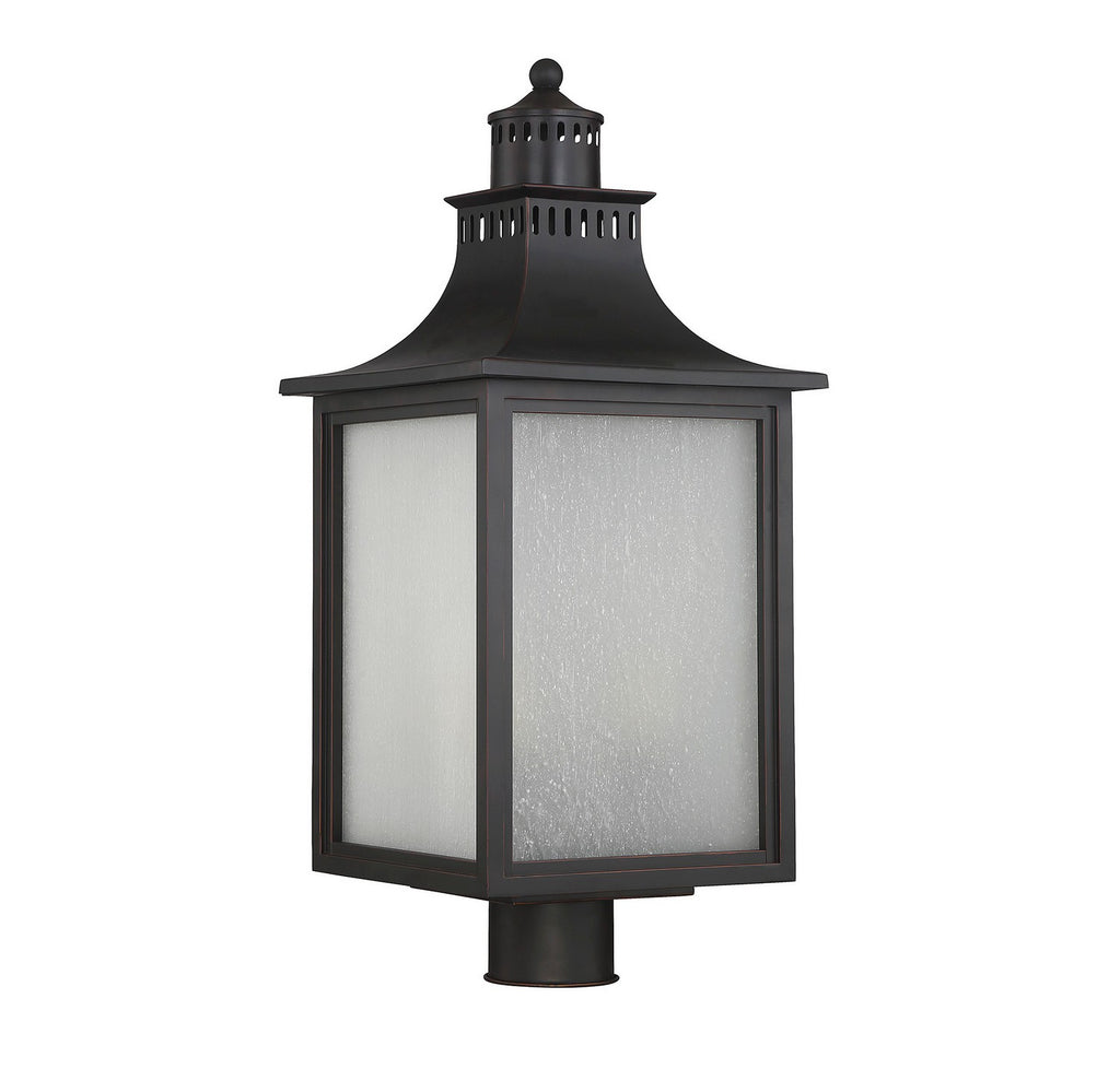 The Savoy House Monte Grande 3-light outdoor post lantern is an elegant, clean-lined version of a classic box-shaped lantern. It's a timeless and pleasing style from designer Karyl Pierce Paxton, a wall lantern that will illuminate the exterior of your home and welcome you and your guests with a familiar, traditional aesthetic. The English bronze finish is a wonderful neutral and the panels are made of beautiful pale cream seeded glass. Three 40W candelabra size bulbs provide plenty of soft light. This lantern is 10" wide, 23.75" high and UL rated for wet locations.