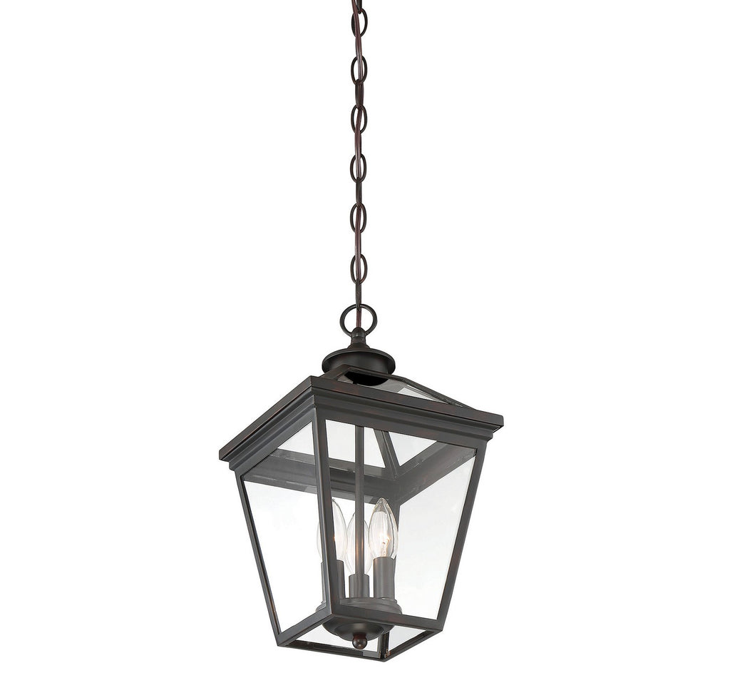 Brighten the exterior of your home and welcome your guests in style with the Savoy House Ellijay 3-light outdoor hanging lantern. The design mimics a vintage gas lantern with a classic tapered box shape and decorative top finial. A sumptuous English bronze finish adds traditional flair and blends well with other hardware and architectural materials. Panes of clear glass fill all four side panels and the roof panels, too. Three 40W candelabra size bulbs provide inviting and secure illumination. This lantern measures 9" wide and 15.75" high.