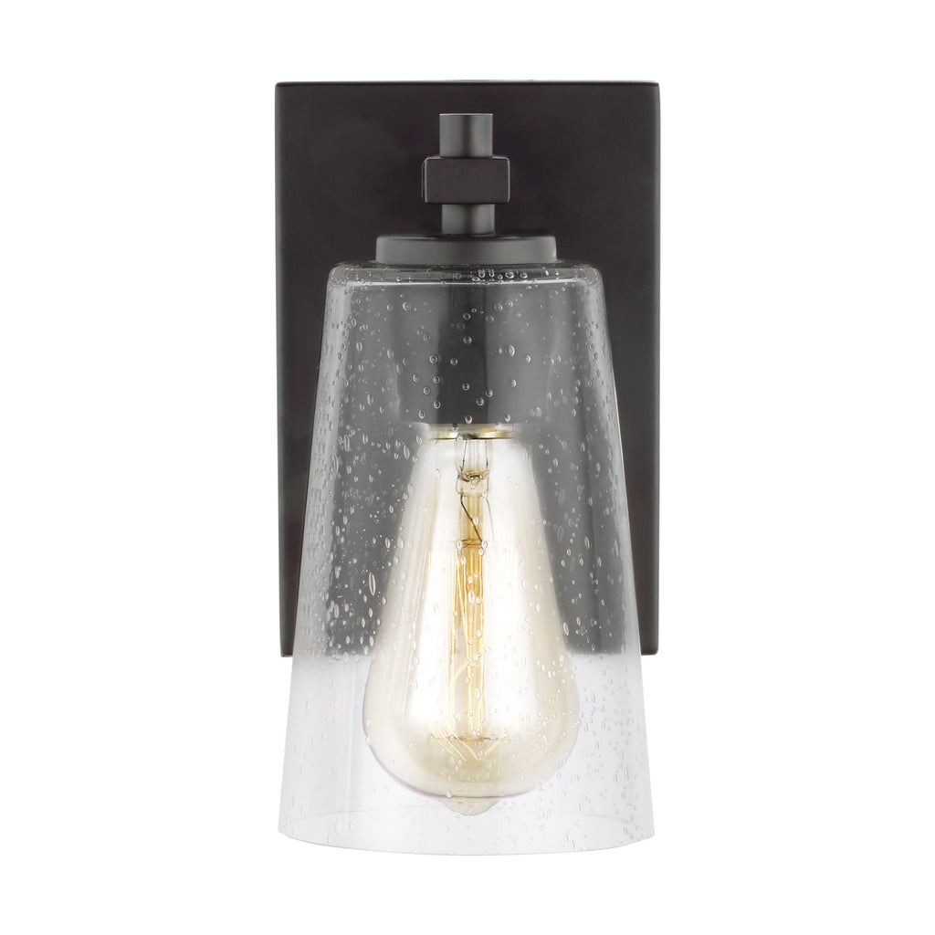 The Sean Lavin Mercer one light wall sconce in oil rubbed bronze provides abundant light for your bath vanity, while adding a layer of today's style to your interior design. Modern details, like the clean square supports of the cross arm and sleek, rectangular backplate, are defining features of the Mercer. Choose from either refreshingly bright Chrome or warm, rustic Oil Rubbed Bronze hardware for a distinct look, both with tapered Clear Seeded glass shades that complete the tailored look.